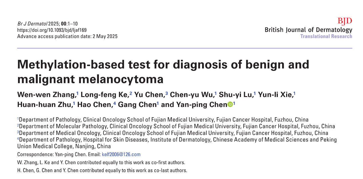 近日,我院病理科团队研究成果《Methylation-based test for diagnosis of benign and malignant melanocytoma(基于甲基化特异性荧光定量PCR方法鉴别良恶性黑色素细胞肿瘤)》在国际顶级皮肤病学杂志——英国皮肤病学杂志《British Journal of Dermatology》(中科院分区医学1区TOP,JCR分区1区,2023影响因子11分)发表。我院张文雯、柯龙凤主管技师等为共同第一作者,陈燕坪、陈刚主任医师为共同通讯作者。