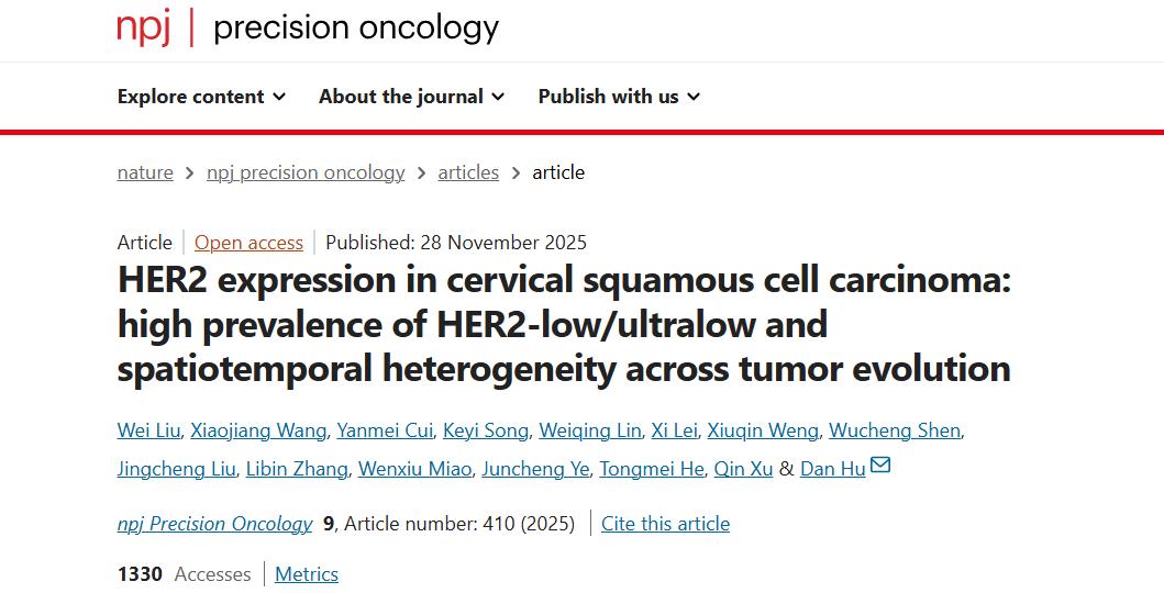 该本研究系统评估了宫颈鳞状细胞癌中HER2的表达状态,发现HER2-low和HER2-ultralow亚型占主导,同时揭示了HER2表达的显著时空异质性。该研究为宫颈鳞状细胞癌接受HER2靶向抗体偶联药物(ADC)治疗提供了新的理论数据。
