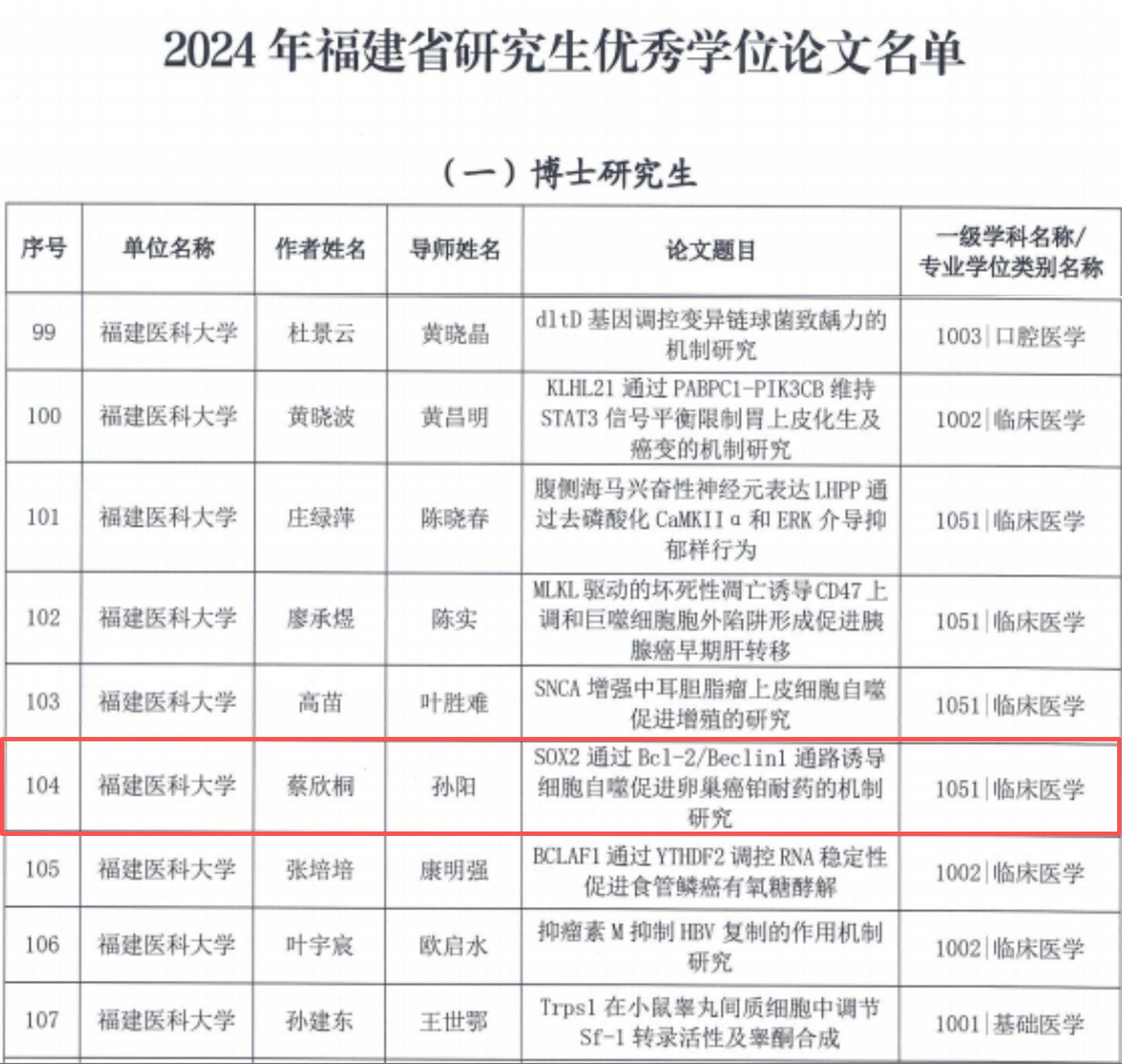 本次获奖论文题为《SOX2通过Bcl-2/Beclin1通路诱导细胞自噬促进卵巢癌铂耐药的机制研究》,该研究从分子机制上揭示了卵巢癌铂耐药的关键调控点,实验设计严谨、分析维度全面,展现了在妇科肿瘤领域的前沿科研视角。肿瘤临床医学院学子已连续两年获得福建省优秀学位论文奖,这一佳绩,是我院长期以来坚持高质量教育、鼓励教学创新与科研探索的直接体现。未来,我院将继续深化教育教学改革,进一步提升研究生培养质量。