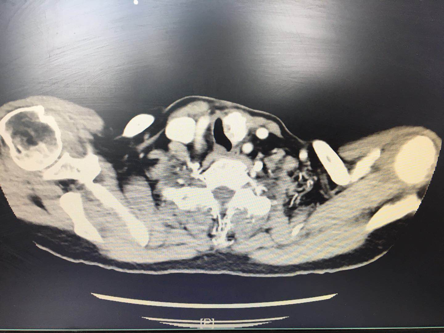 73岁的陈女士,2个月前因发现颈前肿物伴活动后气促就诊当地医院,诊断为甲状腺癌予行手术治疗。术中见双侧甲状腺肿物,其中左甲状腺肿物约鸽蛋大小,质硬,坚如磐石,与气管侧壁紧密粘连并压迫气管变形狭窄,术中经多名专家会诊后一致认为手术风险极大,放弃尝试,只切除右侧腺叶。出院后患者家属经多方打听前来我院头颈外科就诊,林秀安主任医师接诊后予行颈部CT检查,发现左颈气管旁一明显钙化病灶,气管受压变形且严重狭窄(见图1),如不及时处理随病情发展患者随时有窒息死亡危险。