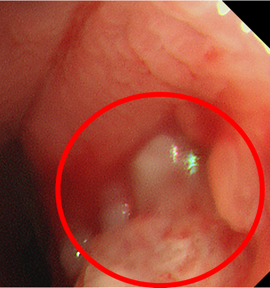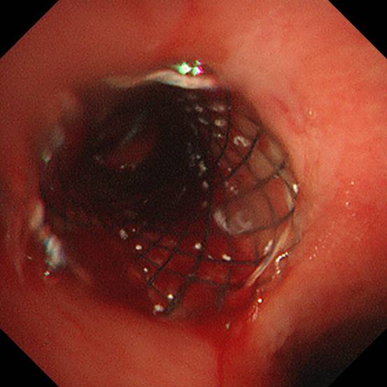 该患者是一位61岁老年男性,系食管鳞癌晚期,经我院胸部肿瘤放疗科陈明秋博士采用化疗及免疫治疗后效果显著,肿瘤明显缩小,但是因为坏死肿瘤侵犯气管,出现进食呛咳,CT及电子气管镜检查提示:食管气管瘘(食管癌侵犯至气道,从而使食道中的食物或消化液漏入气道,引起呛咳)。