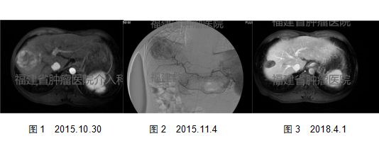 2012年7月,张先生在体检中查出早期肝癌,病理确诊高分化肝细胞癌,五天后就诊于我院介入科林海澜主任团队。介入科主任林海澜主任医师、郝明志主任医师为张先生实施了肝动脉化学栓塞术(TACE)+部分性脾动脉栓塞术(PSE)序贯肝癌射频消融术(RFA),此后张先生遵医嘱定期复查。介入治疗三年后,张先生复查肝脏MR发现右肝存在病灶,病灶最大径5.4cm(图1)。于是,张先生再次接受了TACE+PSE序贯RFA(图2、3)。