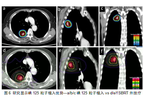 关于张先生的情况,其病灶位于肺门,手术切除或局部消融可能带来的风险较大。碘125粒子植入相对消融来说安全性更好,疗效接近消融。碘125粒子植入是最具代表性的近距离放疗方法。与外放疗相比较,碘125粒子植入能够给予肿瘤更高的辐射剂量,而肿瘤周围正常组织接受的放射剂量更低(图6来自PLoS One. 2017;12(11):e0187390)。