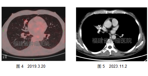 然而,就在张先生第二次介入治疗三年后,肿瘤再次复发了。张先生于2019年3月复查显示右肺门占位,病理穿刺证实肝细胞癌肺转移(图4)。