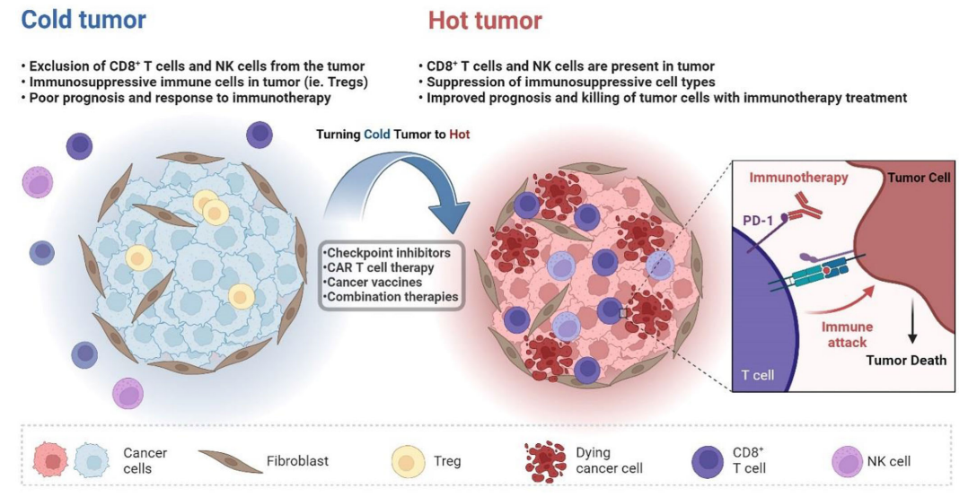 在癌症治疗的战场上,肿瘤的免疫特性对于治疗效果至关重要。科学家们根据肿瘤对免疫反应的活跃程度,将其分为“冷肿瘤”和“热肿瘤”。热肿瘤因免疫细胞的高度活跃而对免疫疗法反应良好,而冷肿瘤则因缺乏免疫细胞浸润而对免疫疗法具有抵抗性。冷肿瘤的治疗成为了一个巨大的挑战,但也是研究的热点。