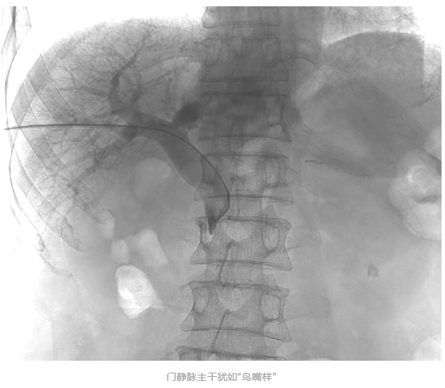 胡育斌主任医师团队在方主亭副院长的指导下开展手术。术中造影显示:肠系膜上静脉完全闭塞,门静脉主干受肿瘤压迫呈“鸟嘴样”狭窄(见下图),血流近乎中断,情况极为严峻。