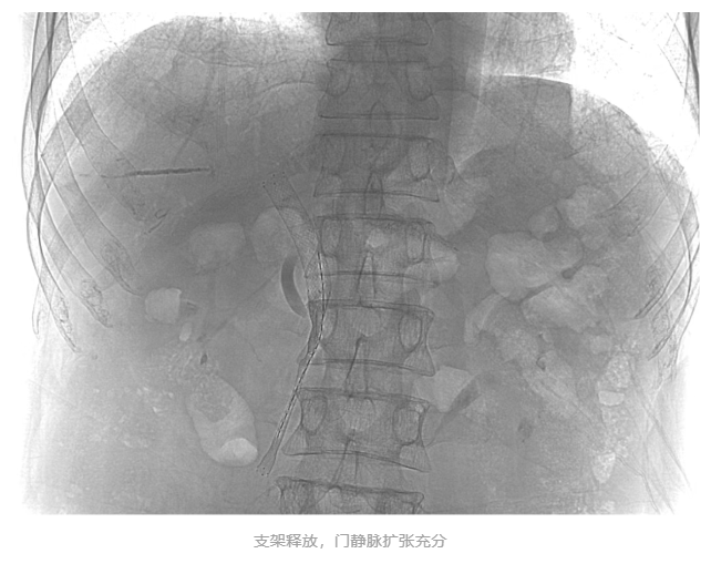 团队凭借精湛的介入技术和丰富的经验,成功使用黑泥鳅导丝穿越闭塞段,开通肠系膜上静脉。随即,金属支架释放,血管瞬间扩张,造影显示门静脉回流顺畅。与此同时,精准植入碘125粒子条,内照射治疗周边癌细胞以抑制肿瘤继续侵犯血管。