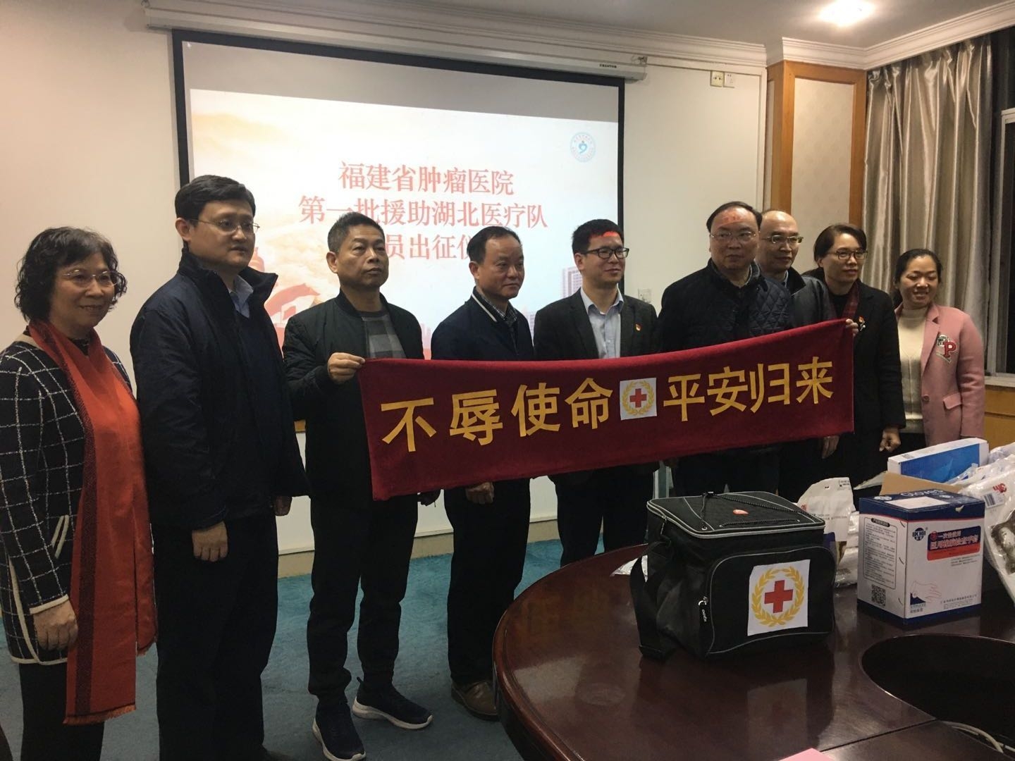 1月26日(正月初二),晚上七时,万家灯火。福建省肿瘤医院第一批援助湖北医疗队队员出征仪式在科研楼会议室举行,检验科苏光建同志将远赴湖北抗击疫情最前线,全体院领导及有关科室负责人为他出征送行。