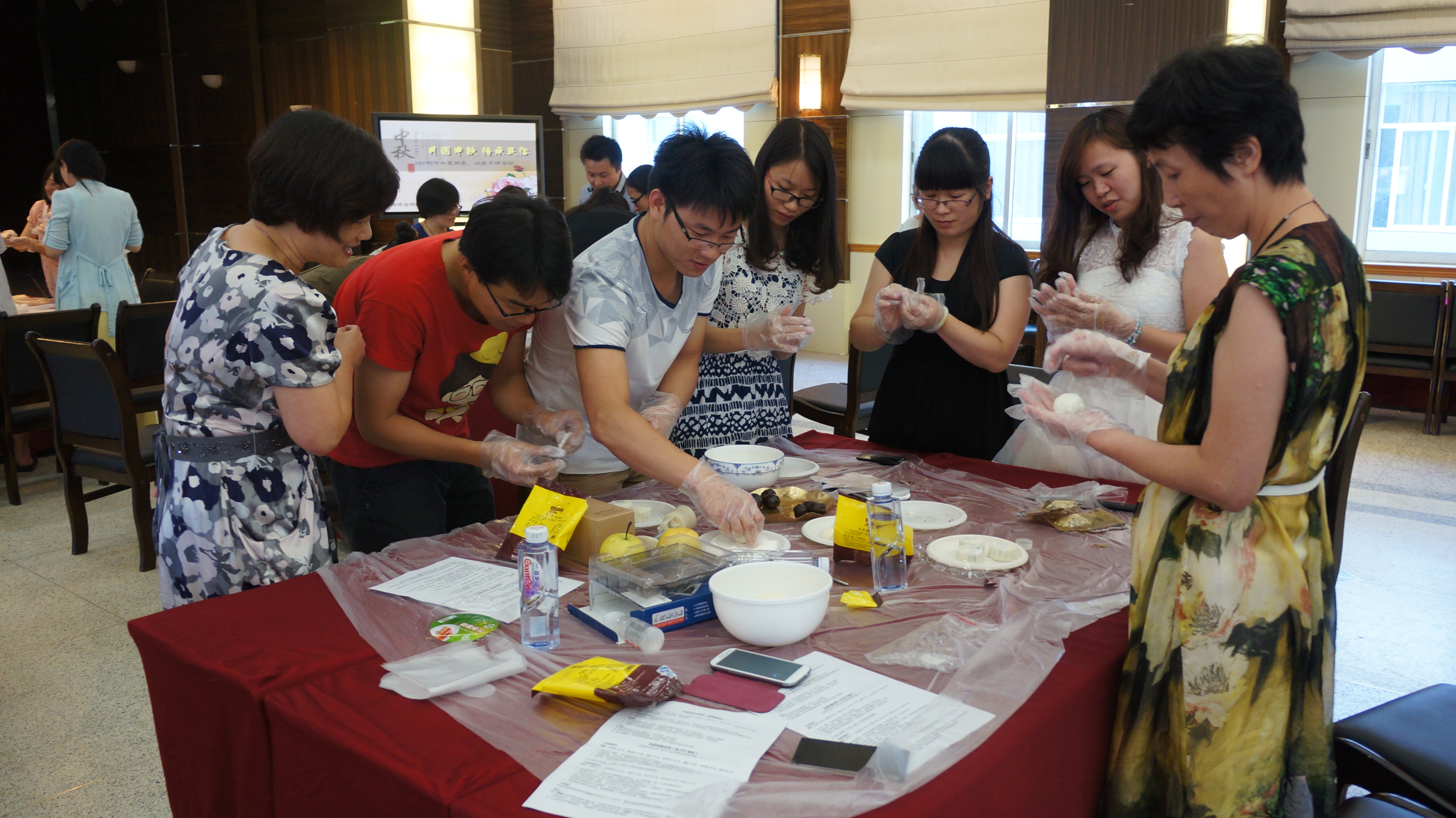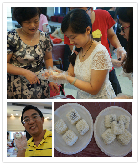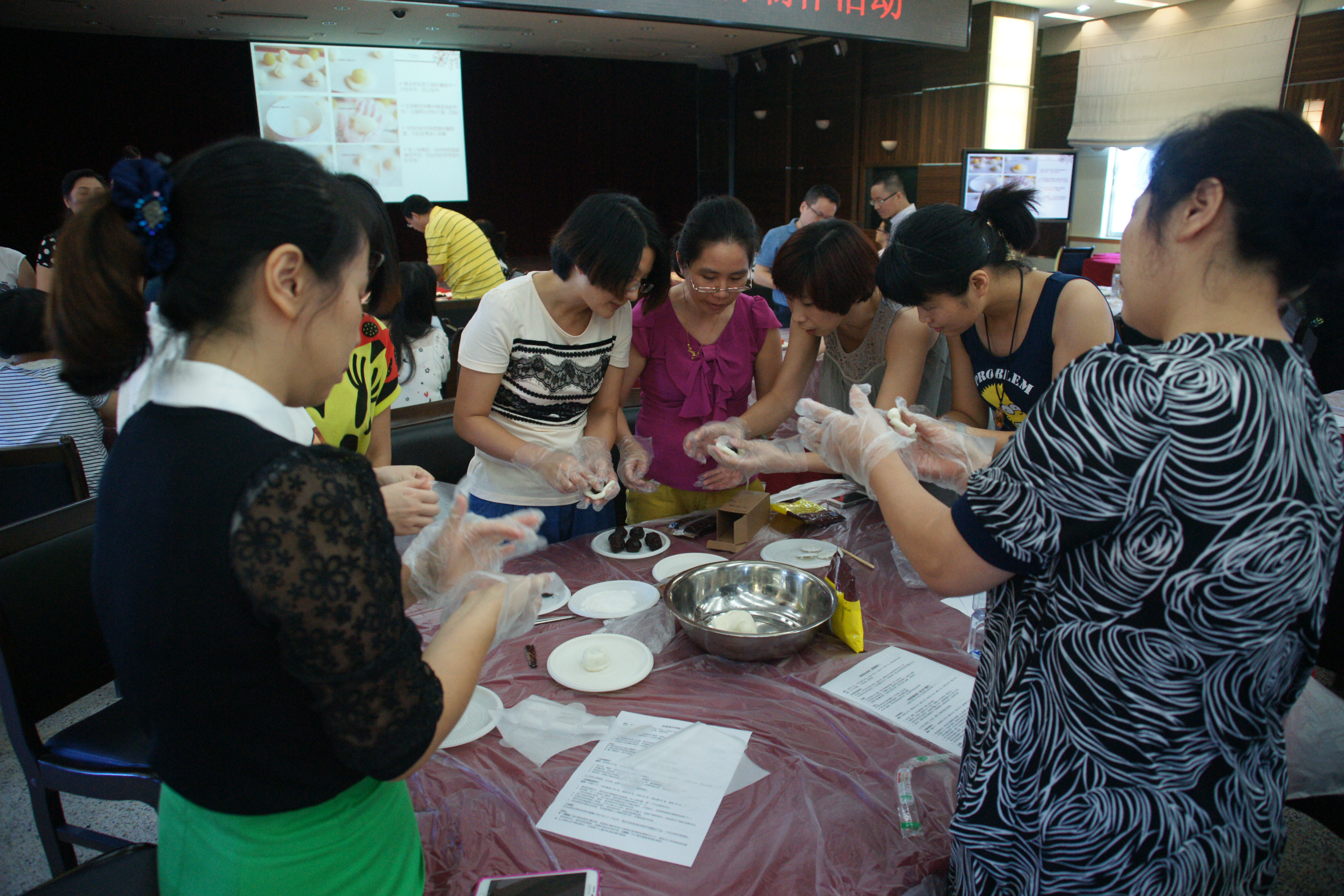 又逢中秋月圆时,总让人不禁吟诵明月之诗。既有“举头望明月,低头思故乡”的感怀,也有“但愿人长久,千里共婵娟”的期盼。月饼是久负盛名的汉族传统小吃,是中秋必食之品,承载着人们对家人团聚的美好愿望,和对亲朋好友深深的思念。8月5日,行政一片、二片联合举办了以“月圆中秋,传承明俗”为主题的月饼制作活动。大家先是围坐桌前欣赏了精巧细致的水果拼盘的雕刻,再是合力制作可口的冰皮月饼,进行简单有趣的互动游戏。红绸布罩桌台,故友新朋伴两侧,别有一番“家”的滋味。