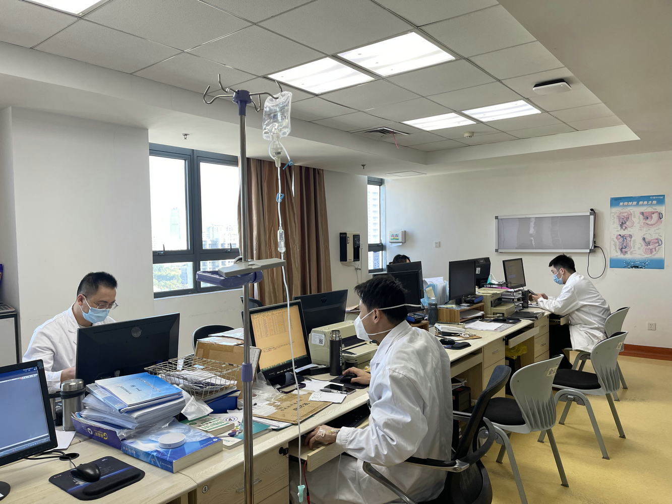 上班及值班人员骤减的情况下,薛忠医生在感染的第二天挺身而出,“我症状轻,我来值夜班,让大家多点时间休息吧”,“我是年轻人,我可以”,王鸣医生强忍高热不适,在边输液边为患者进行治疗的情况下加入科室值班的队伍。“我没有被感染,我可以坚持上班,让大家多休息恢复体力,争取早日归队”,陈金钗护士作为科室护理人员中仅剩未感染的人员,她主动请缨,值夜班,上白班;王燕护士长在感染第二天高热一退去后,就马上返岗,和科室的医务人员共同保障患者的治疗护理有序进行。