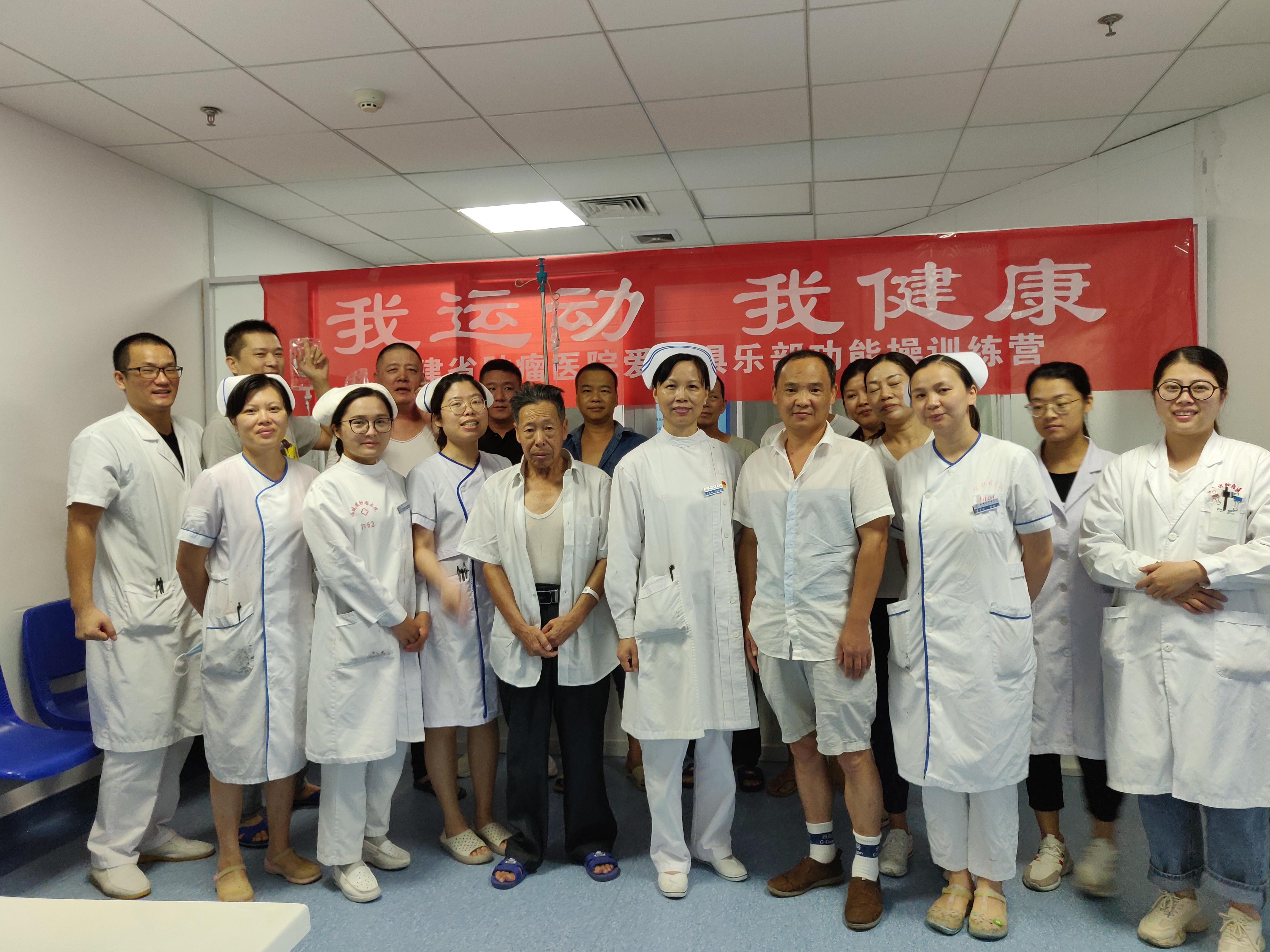 814日下午,为积极响应上级部门“三服务一先锋”的号召,在福建省肿瘤医院青年文明号争创集体十六区的活动室,举办了十六区暨爱鼻俱乐部功能操训练营活动,功能操训练营旨在帮助鼻咽癌患者提高生活质量,减少放疗后并发症的发生,通过功能操锻炼使患者获得健康并且促进医护患关系和谐,提高服务质量。本次活动人数包括活动志愿者、患者观众及其家属将近60人,小小的活动室挤满了前来学习功能操的观众,有些观众来晚了认真的站在门口听讲练操,整个活动会场充满了欢声笑语。