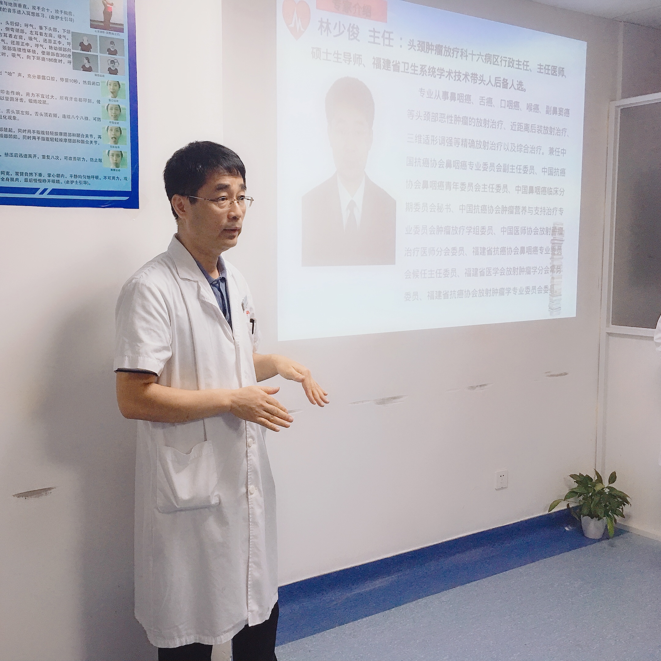 本次活动由十六区陈秀梅护士长主持,首先由十六区行政主任著名专家林少俊主任发表讲话,内容旨在说明功能操锻炼在鼻咽癌康复训练中的重要作用,提高患者坚持锻炼的信心,随后由十六区资深护士黄斌为大家带来别开生面的小讲课——《鼻咽癌相关知识》,内容浅显易懂,观众听完表示更进一步了解了鼻咽癌相关知识,大加赞赏,在此起彼伏的掌声中,十六区两位年轻活力的青年团员邓艳萍护士和陈玉梅护士登场了——本次的带操者,她们认真为患者示范鼻咽癌功能操及PICC功能操的锻炼步骤,观众纷纷跟着做起来,现场气氛活跃。将近一个小时的活动获得的患者朋友的好评,希望多举办类似活动,一定积极参与其中。