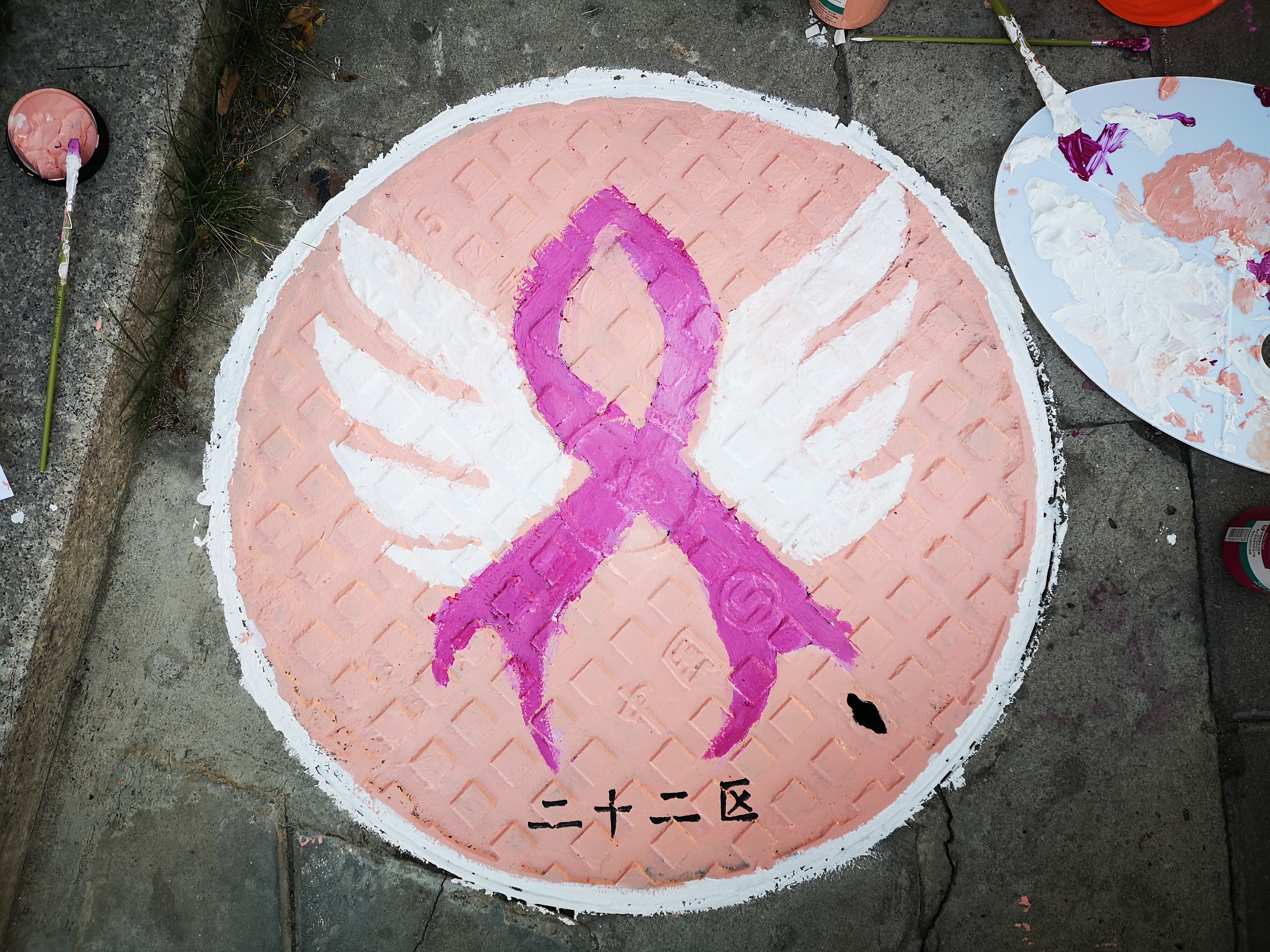 一幅幅井盖画上,有充满笑容的卡通医护人员,有祝福祖国、健康中国,还有守护健康、“滚蛋吧 肿瘤君”、粉红丝带、“大白”等文字图案,多彩的井盖,饱含着对祖国、医院、防癌抗癌事业的衷心热爱和美好祝福,充满了希望和温暖的正能量。
