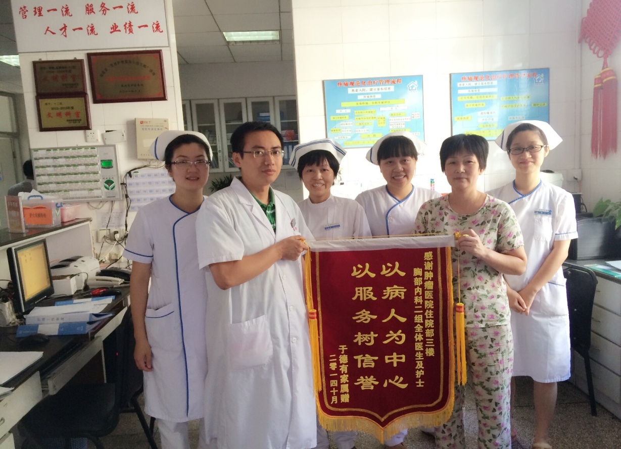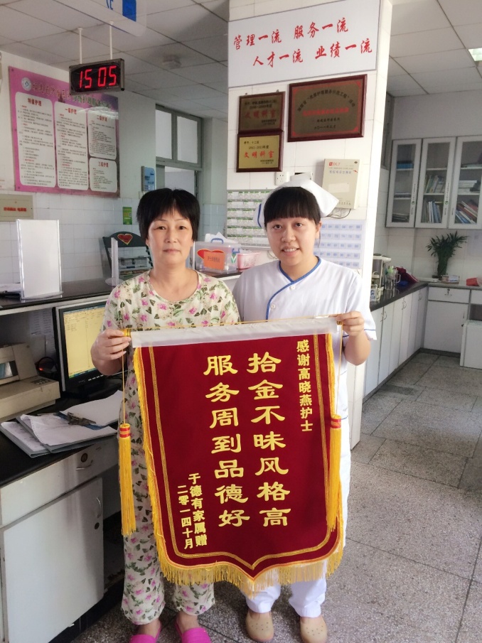 2014年国庆期间,胸部肿瘤内科十二区护士高晓艳像往常一样巡视病房查看病房患者情况,巡到23床病床时,在床头枕头旁发现了部分现金。高晓艳护士立刻想到这肯定是刚出院的患者遗留的,于是,她赶紧通知护士长,并根据登记信息很快找到了失主。当家属拿到遗失的现金时,感激之情溢于言表,称赞我院不但医术精湛,而且医务工作者医德高尚,随后送来了两面写有“拾金不昧风格高、服务周到品德好,以病人为中心、以服务树信誉”的锦旗,表达感谢之情。