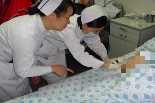 入院后,病情较重的老杨先后发生了五次的上消化道大出血,二十区的医护人员积极抢救,次次都把老杨拉回了生命线。不光如此,病重期间,因为用了降低门脉高压的药,老杨几乎每五到十分钟就需排大小便,导致骶尾部皮肤发红。林丽副护士长天天到床旁观察老杨的皮肤情况,并多次亲自为老杨换药、涂药。张露护士每半小时就为他清洁骶尾部皮肤,喷涂溃疡粉和液体皮肤保护膜。正是她们贴心细致的照料,入院三个月以来,老杨骶尾部皮肤一直保护较好。郝明志、胡育斌医生还常常抽空给家属做思想工作,积极调整他们的心态,嘱咐他们放下包袱,积极配合医生对老杨的诊治。医生的专业治疗,加上护士的精心照顾,让老杨的病情也稳定了不少。