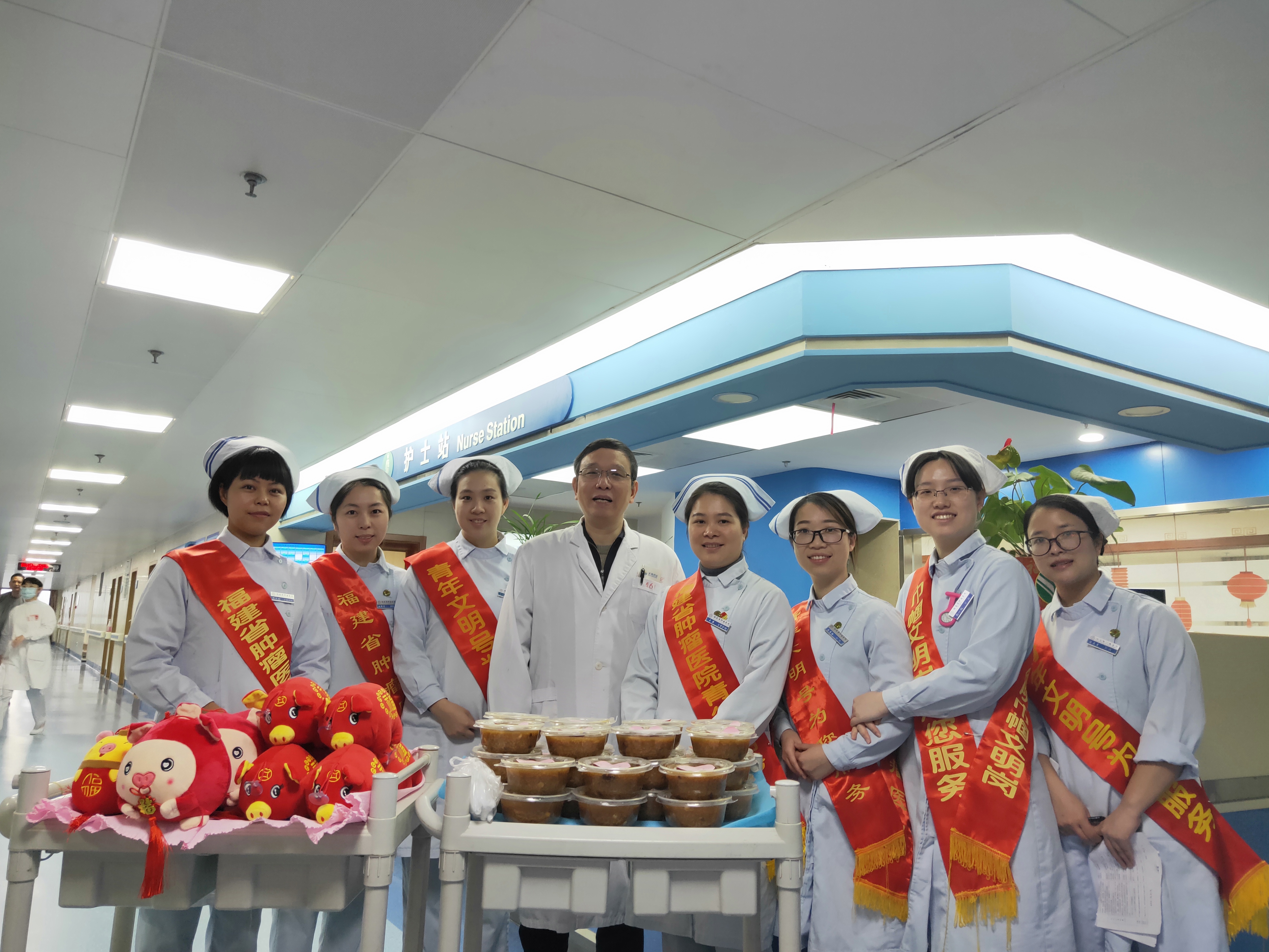 农历正月廿九是拗九节,福州传统的孝老爱亲节日。在这特殊的日子里,我院八区肝胆胰肿瘤外科病房泛着甜甜的粥香,一碗碗热气腾腾的拗九粥整整齐齐地摆放在护士们的推车上,早早地送到住院患者的手里。为烘托孝老爱亲气氛,病区还特意准备了福气小猪为老年患者送福气。