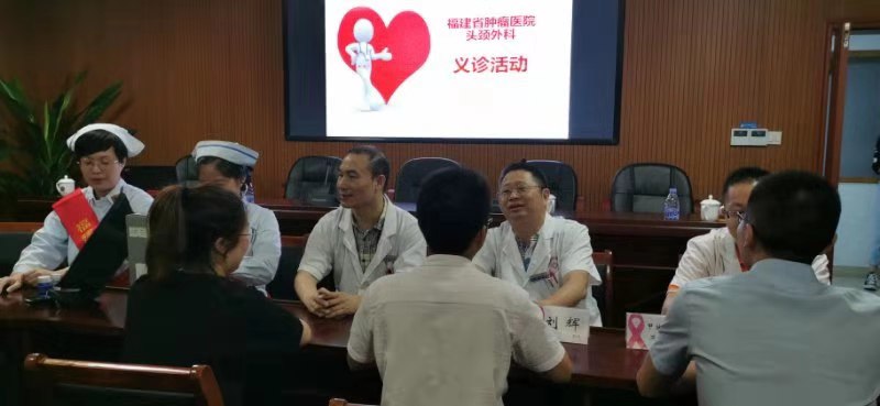 头颈外科刘辉主任、林秀安主任医师、施友元副主任医师仔细地为就诊人员进行头颈部疾病的诊查,并耐心解答他们的疑问。刘健主任医师、林琳主任医师、吴凡副主任医师、洪熠副主任医师等针对乳腺疾病为就诊人员进行细心的诊查,认真解答群众的咨询问题并普及相关抗癌知识。