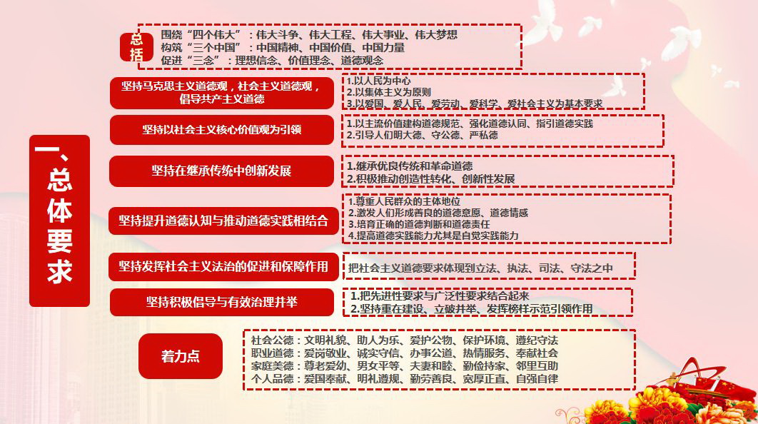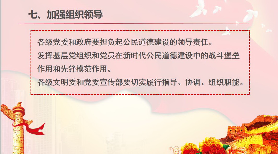 《纲要》共有 七个部分,主要包括新时代公民道德建设的总体要求、重点任务、深化道德教育引导、推动道德实践养成、抓好网络空间道德建设、发挥制度保障作用和加强组织领导等内容。