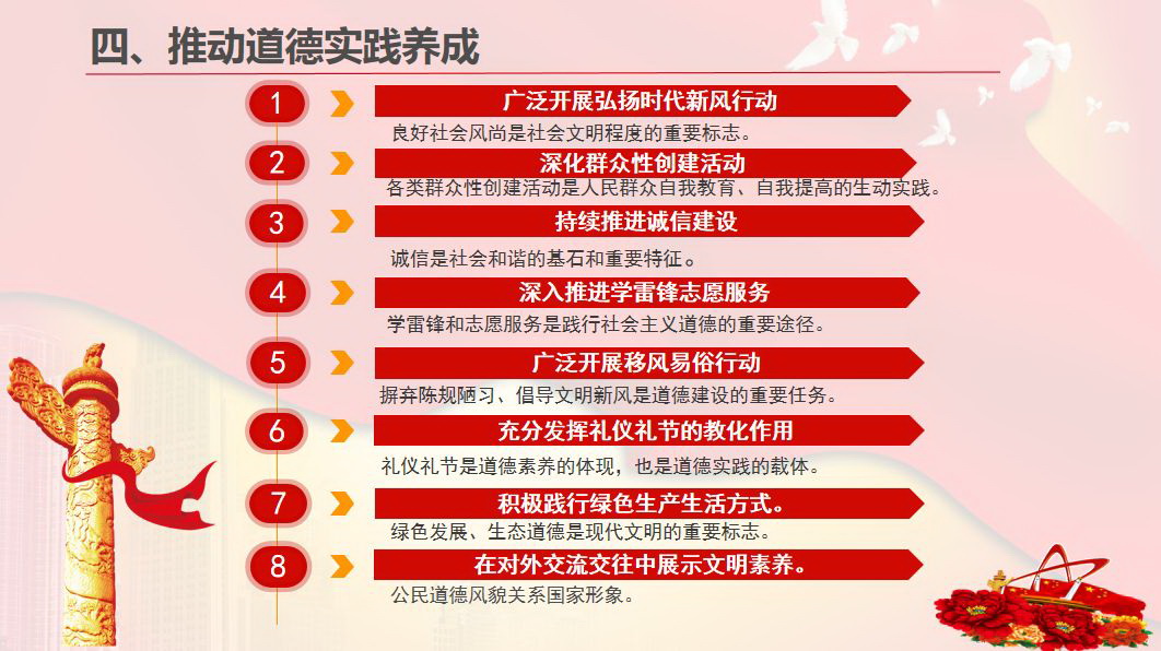 三是 坚持守正创新。《纲要》既继承了2001年《公民道德建设实施纲要》的主要内容和载体途径,又立足新时代新形势新任务要求,突出问题导向,着重体现习近平总书记对党员领导干部、青少年和社会公众人物等重要群体和重点领域道德建设的重要论述和具体要求,重点强化了法治保障、网络空间、生态文明、对外交往等方面的内容,既遵循了道德建设规律,又进行了创新创造,增强了道德建设的吸引力感染力。