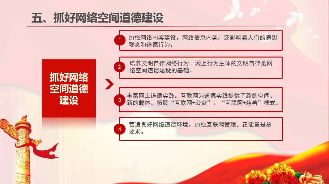 四要 营造良好网络道德环境。严格依法管网治网,强化网络综合治理,建立完善新技术新应用道德评估制度,维护网络道德秩序;开展网络治理专项行动,加大对网上突出问题的整治力度,反对网络暴力行为,依法惩治网络违法犯罪,促进网络空间日益清朗。