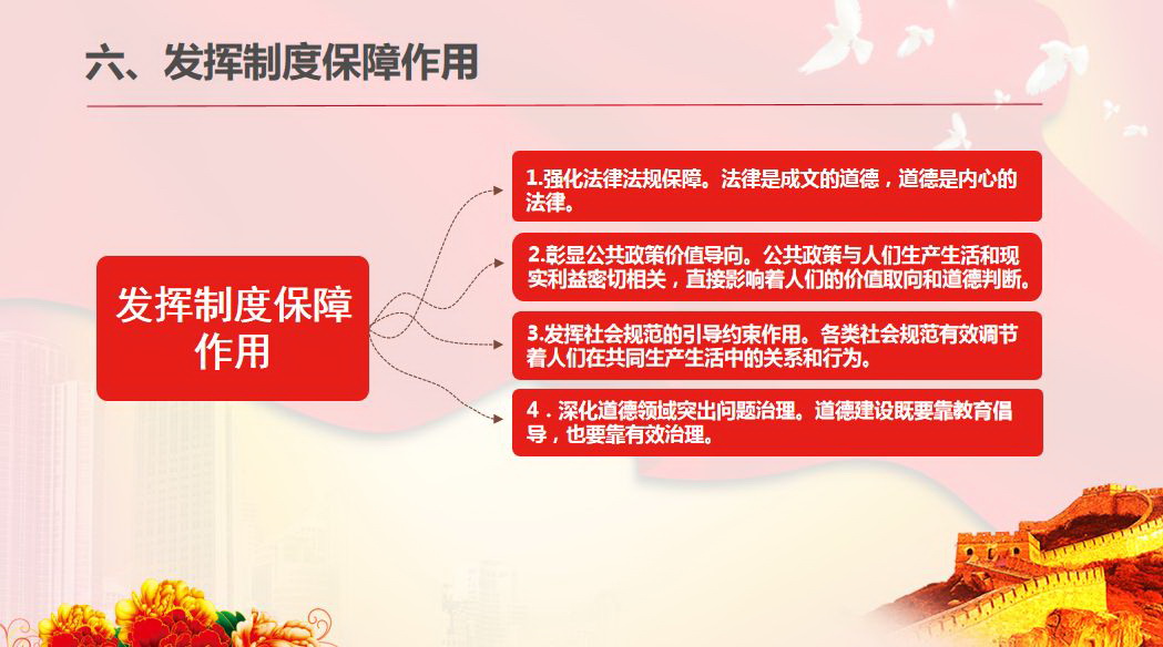 四是强化道德建设的法治保障。法律是成文的道德,道德是内心的法律,道德建设离不开法治保障。要推动《社会主义核心价值观融入法治建设立法修法规划》的贯彻落实,建立社会主义核心价值观入法入规协调机制。要把社会主义道德要求融入社会治理,探索建立重大公共政策道德风险评估机制,健全各行各业规章制度, 完善市民公约、村规民约、学生守则、团体章程等。要加强道德领域突出问题专项治理,不断净化社会文化环境。