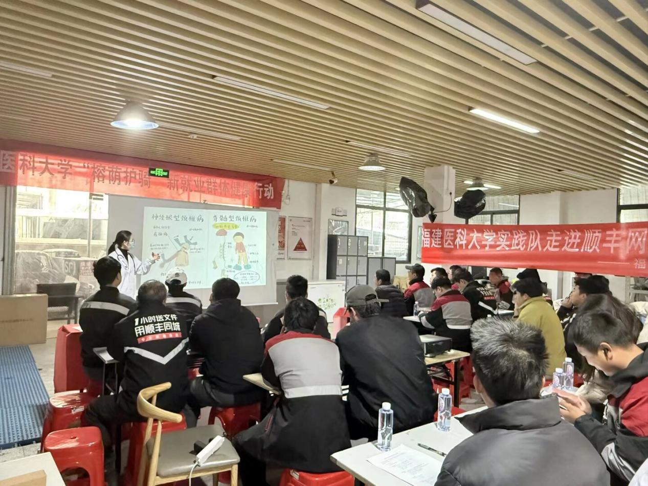 学习指向践行。实践团依托福州市“榕荫护骑”新就业群体健康行动项目,对接福州大学城顺丰快递驿站,开展“防寒保暖·健康同行”主题健康服务。团队前期结合冬季作业特点,编撰《骑手冬季安全骑行/健康手册》,内容实用、通俗易懂。活动当日,成员为骑手提供血压测量、肌肉骨骼劳损筛查及康复指导,累计服务近百人次,发放手册近百份。服务现场反响积极,福州顺丰工会钟主席莅临现场并表示,此类精准对接职业特点的健康服务对配送员群体具有切实价值。