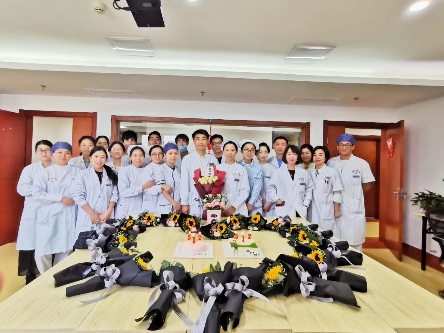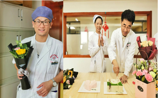 和谐第二乐章:医生为护士献上鲜花,林少俊主任为大家切蛋糕。
