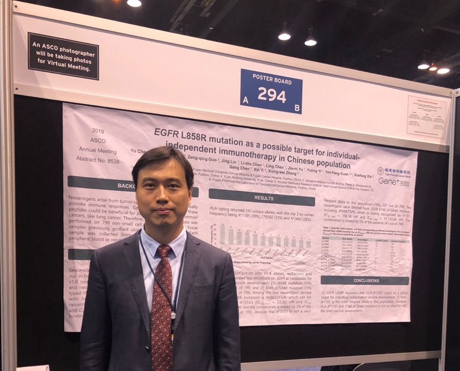 2019 ASCO年会于5月31日至6月4日在美国芝加哥举行。我院党委书记、院长郑雄伟教授、陈刚教授带领的病理科团队和肿瘤生物治疗免疫中心郭增清教授、陈誉教授团队以壁报(Poster)形式展示针对EGFR L858R亚型新抗原预测筛选的最新研究进展。陈誉教授代表团队在ASCO做壁报展示,分享研究成果,受到国内外同仁的广泛关注和讨论。
