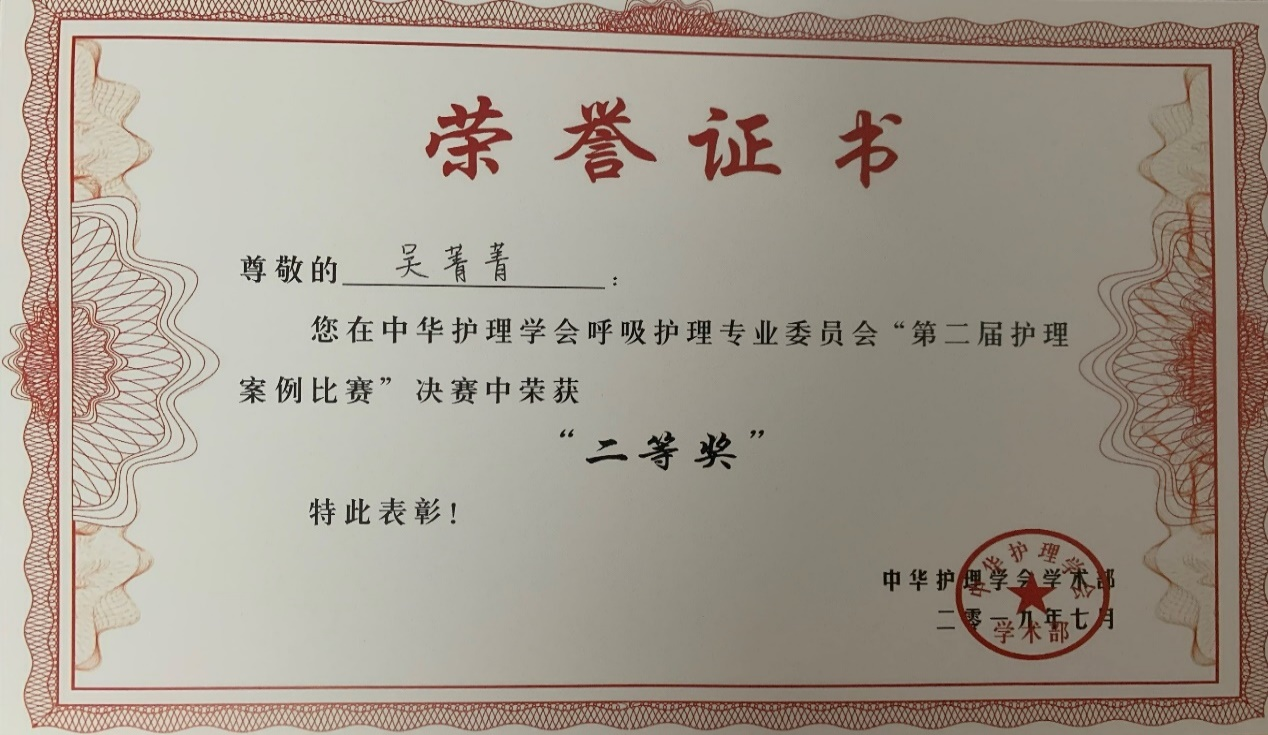7月17日—7月19日,中华护理学会第二届全国呼吸护理学术交流会议在广州召开。本次会议除主会场外,特设大会征文、护理案例比赛、创新比赛、辩论比赛分会场。我院胸外科一区吴菁菁护师,代表我院参加此次护理案例比赛。全国119名参赛选手经过专家两轮复评后40名进入决赛,吴菁菁护师经过福建省初赛、全国决赛后最终获全国二等奖佳绩。