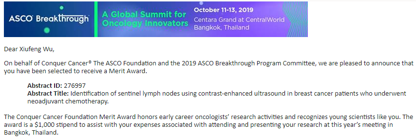 在我院5区乳腺外科陈夏主任、曾毅主任的科研学术指导下,乳腺外科吴秀凤医师团队的研究成果喜获ASCO Breakthrough顶尖的肿瘤研究学术奖项--2019 ASCO Conquer Cancer Foundation of Merit Award!获得$1000奖金及免除参会注册费。