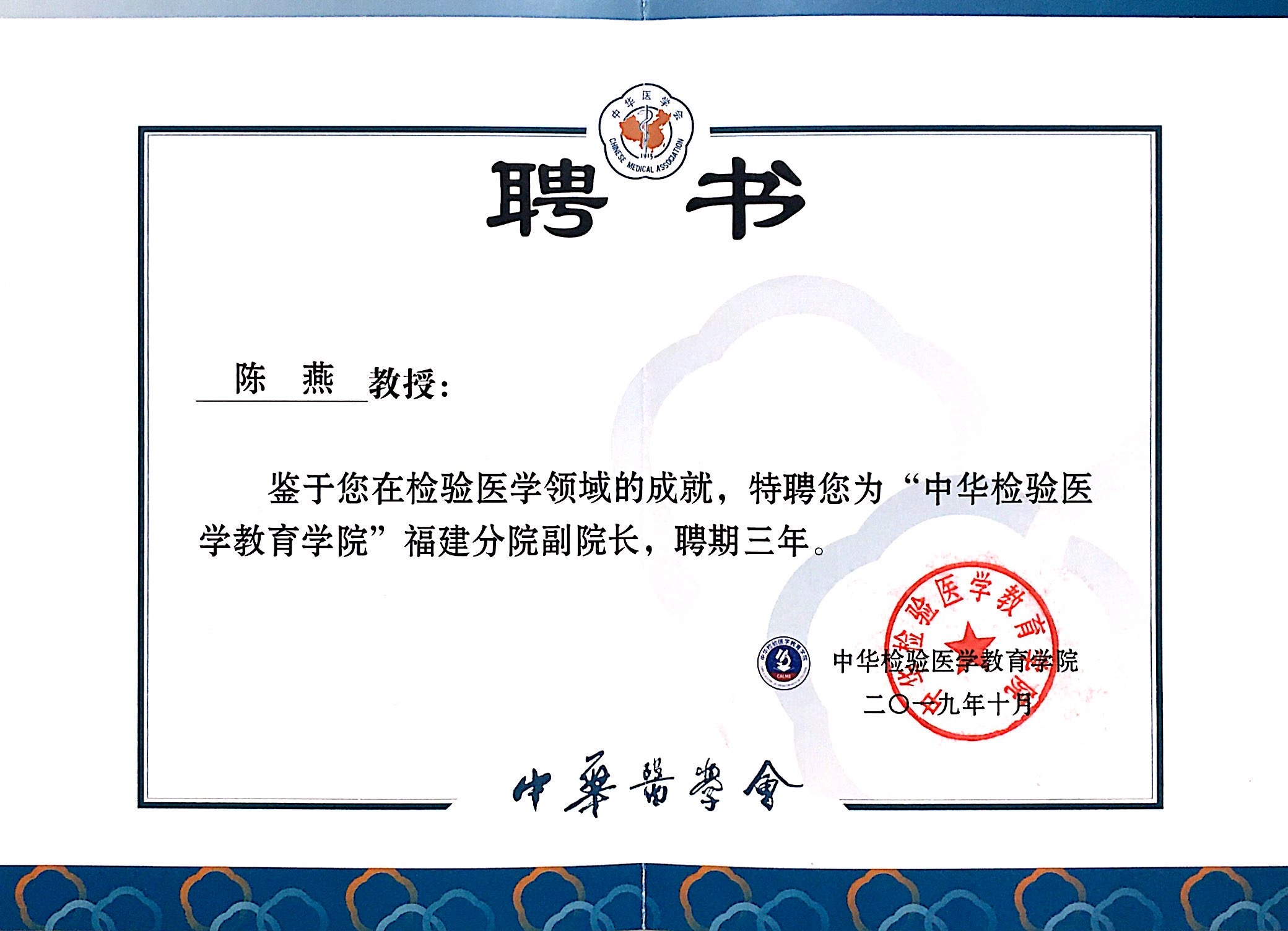 10月18日,由中华医学会主管,中华医学电子音像出版社、中国医学科学院北京协和医院、中华检验医学教育学院联合主办的中华检验医学教育学院在北京成立。学院在全国各省份设立了31所省级分院,我院检验科主任陈燕教授被聘为“中华检验医学教育学院”福建分院副院长。