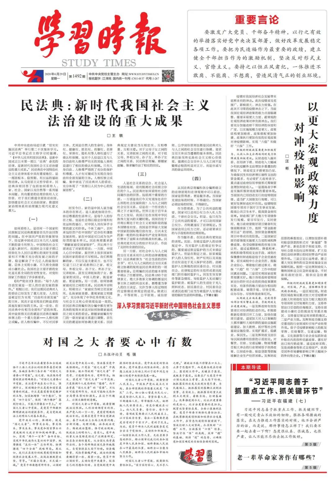 6月29日,中国法学会民法典编纂项目领导小组秘书长、中国人民大学法学院院长王轶在《学习时报》头版头条刊发文章《民法典:新时代我国社会主义法治建设的重大成果》,供大家学习。