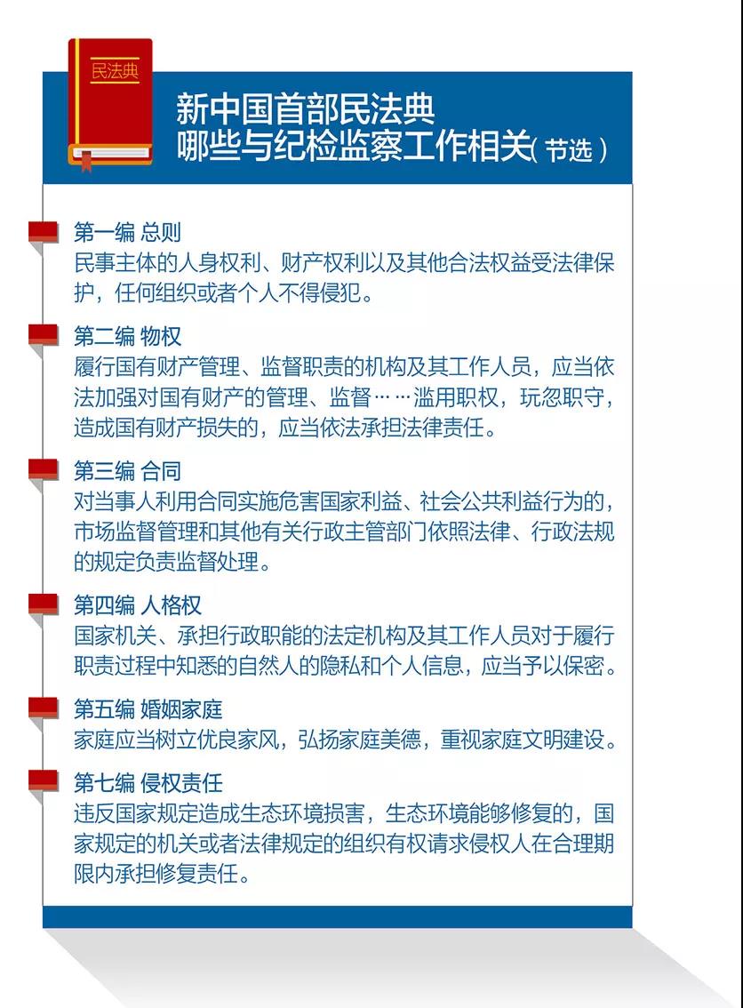 仔细翻阅民法典,在原有规定的基础上,对群众生命健康、财产安全、交易便利、生活幸福、人格尊严等各方面权利进行了全面准确的界定和保护,为党政机关行使公权力划出更加清晰的范围与界限。如物权编部分指出,征收组织、个人的房屋以及其他不动产,应当依法给予征收补偿……任何组织或者个人不得贪污、挪用、私分、截留、拖欠征收补偿费等费用;人格权编部分指出,国家机关、承担行政职能的法定机构及其工作人员对于履行职责过程中知悉的自然人的隐私和个人信息,应当予以保密,不得泄露或者向他人非法提供,等等。这些都将为纪检监察机关更好约束公权力提供精确的标尺,为促进公职人员依法履职保护民事权利树立更明确的参照系。