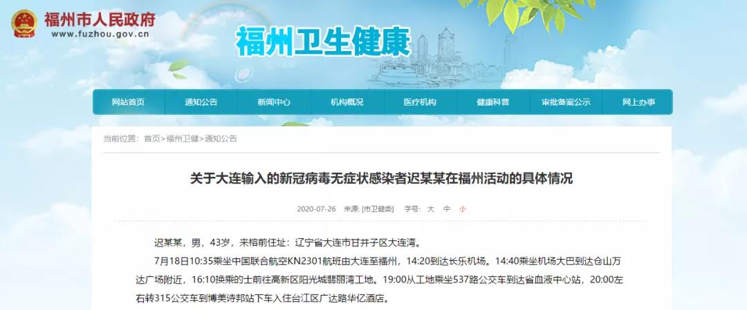 刚刚,福州市卫健委发布大连输入无症状感染者在福州的活动轨迹