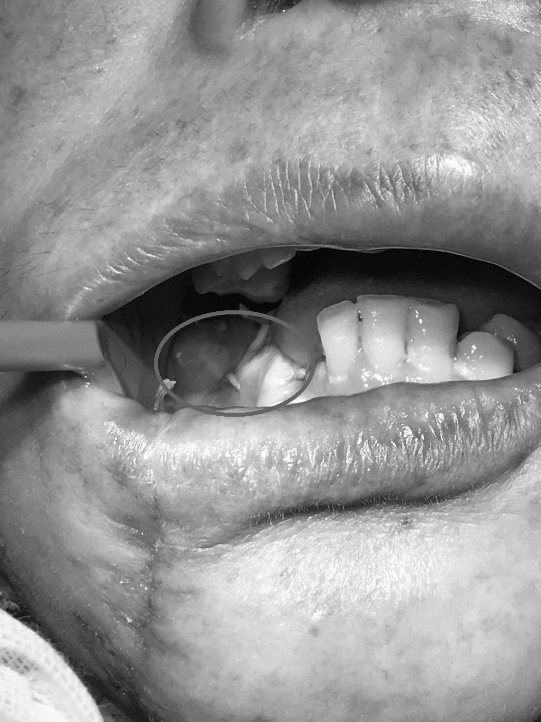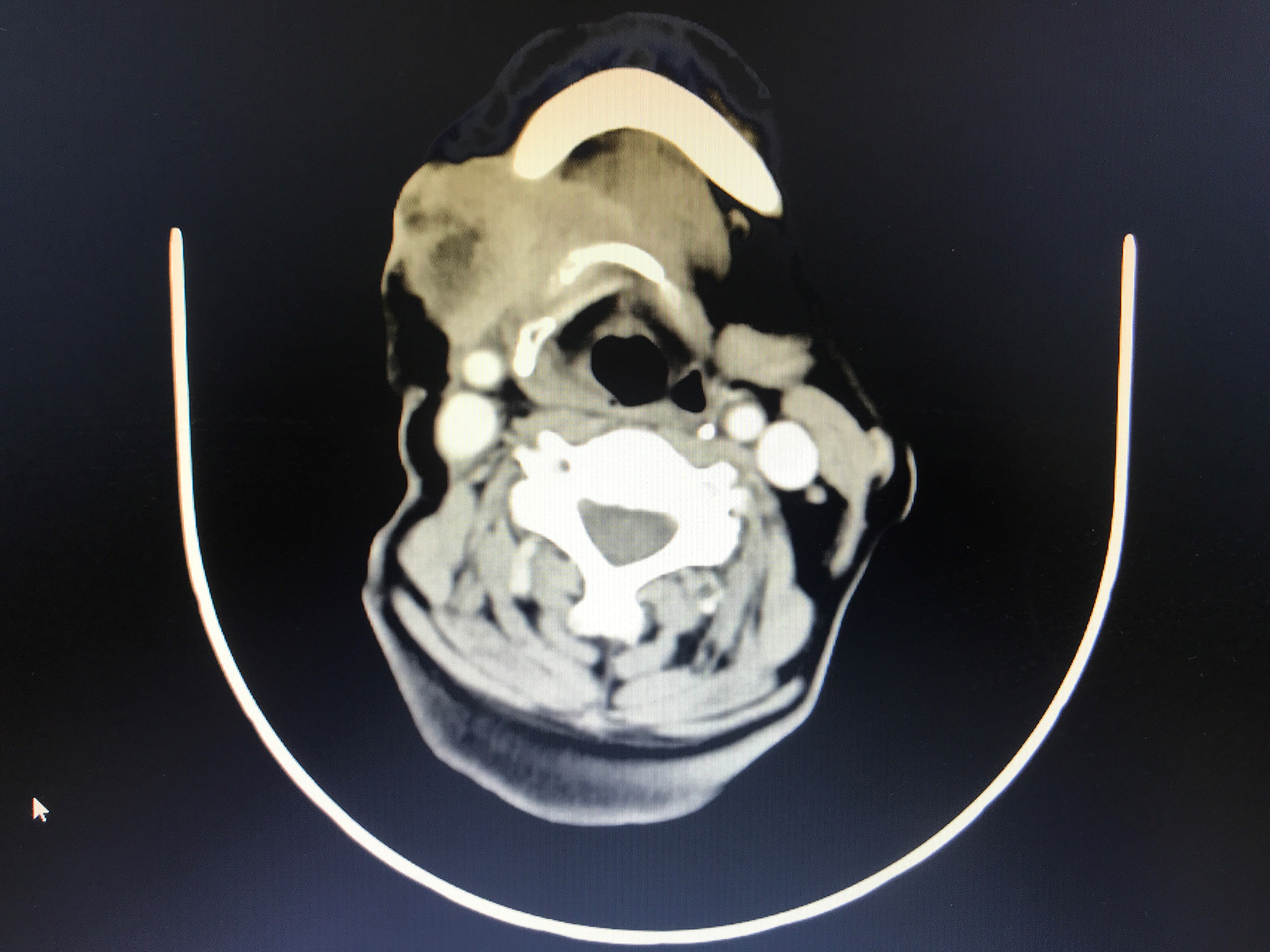 患者65岁,5年前确诊为“右舌鳞癌”并进行手术,今年年初因出现右颌下区复发,受疫情影响,未能及时就医,出现肿瘤增大并局部皮肤破溃症状,CT提示肿瘤包绕右下颌骨,并侵犯右侧口底,与右颈总动脉关系密切。