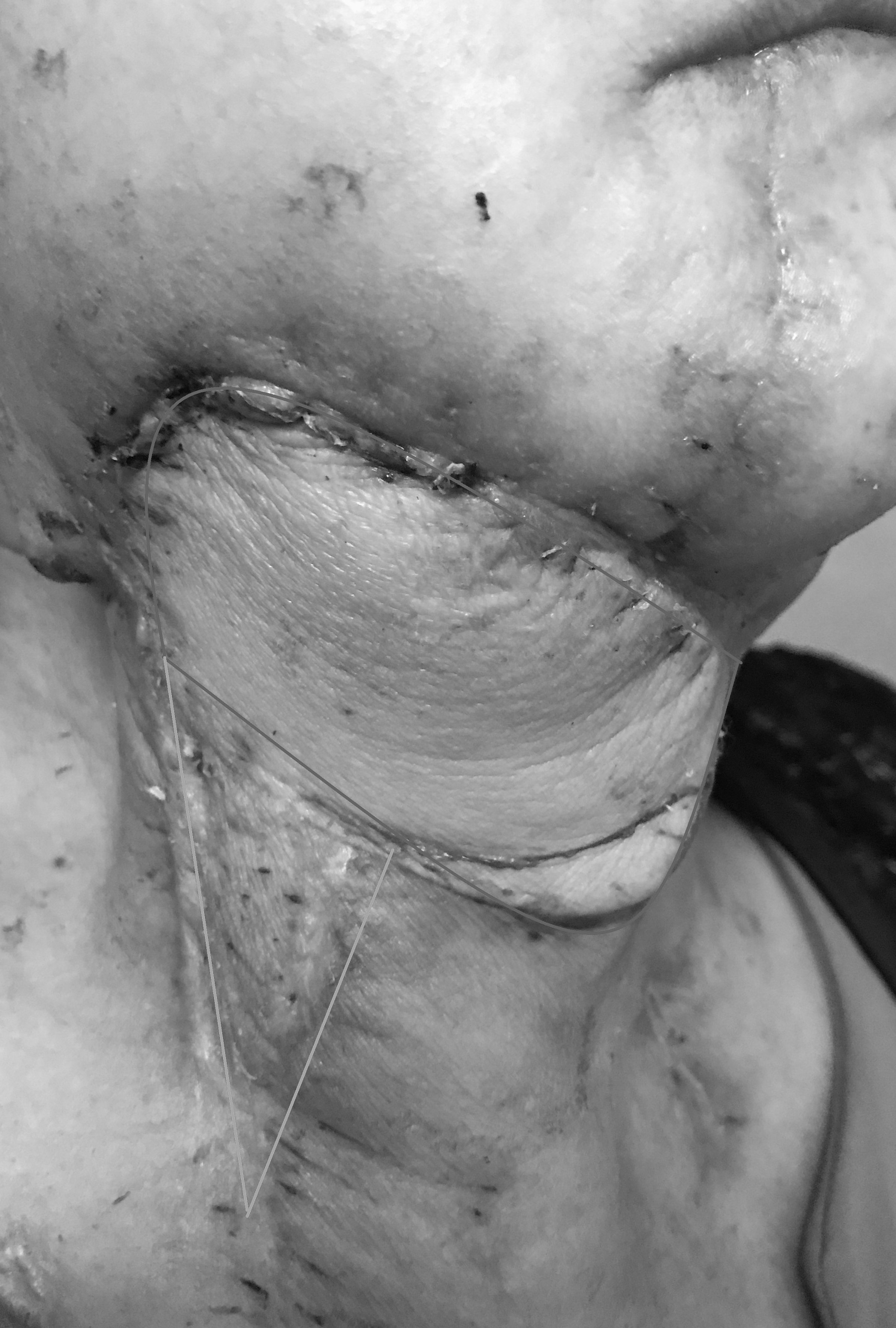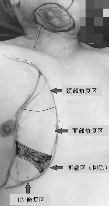 我院头颈外科收治患者后,经过检查并初步认为,患者复发肿瘤侵犯范围较广,手术需要将颌下区受累的皮肤、右下颌骨、右侧半舌及口底组织连同转移癌一并切除,形成颌面部洞穿性缺损,颈部皮肤缺损,因颈内静脉及颈动脉的分支切除,且难以再行游离皮瓣修复。为克服这个难题,头颈外科团队为患者精心设计了手术方案,采用胸大肌皮瓣修复,将右侧胸大肌皮瓣分成三个部分,分别修复口底缺损,面部缺损及颈部缺损。这种“一瓣三补”的手术方案,完美地解决了术后修复及功能重建,为这例复发晚期的头颈部鳞癌患者再次迎来生机。