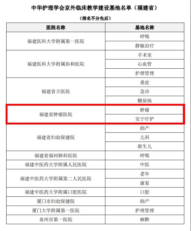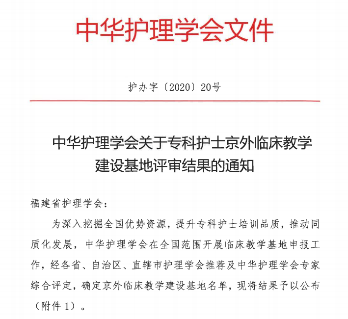 近日,我院肿瘤和安宁疗护专科护士入选国家级临床教学建设基地。 2020年7月,中华护理学会、福建省护理学会分别在全国、全省开展中华护理学会专科护士京外临床教学基地评选和福建省护理学会首批专科护士临床教学基地评选工作。经过福建省护理学会初评和复审,我院肿瘤专科、安宁疗护专科及静疗专科获福建省护理学会专科护士临床教学基地,其中肿瘤专科及安宁疗护专科获中华护理学会专科护士临床教学基地。