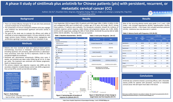 徐沁教授介绍,此次研究纳入接受过至少一次铂类全身化疗、经组织病理证实为复发或转移的晚期宫颈癌(包括鳞状细胞癌、腺癌或腺鳞癌)、PD-L1表达超过1%、ECOG 0-1的患者。最终研究结果可见,靶向免疫联合治疗晚期宫颈癌的客观缓解率达到70.6%,是其他晚期宫颈癌治疗方案的2-3倍;疾病控制率达到100%。显示了巨大的临床治疗潜力。徐沁团队设计的“安罗替尼联合信迪利单抗”方案无疑为晚期宫颈癌治疗带来了可期待的用药选择。