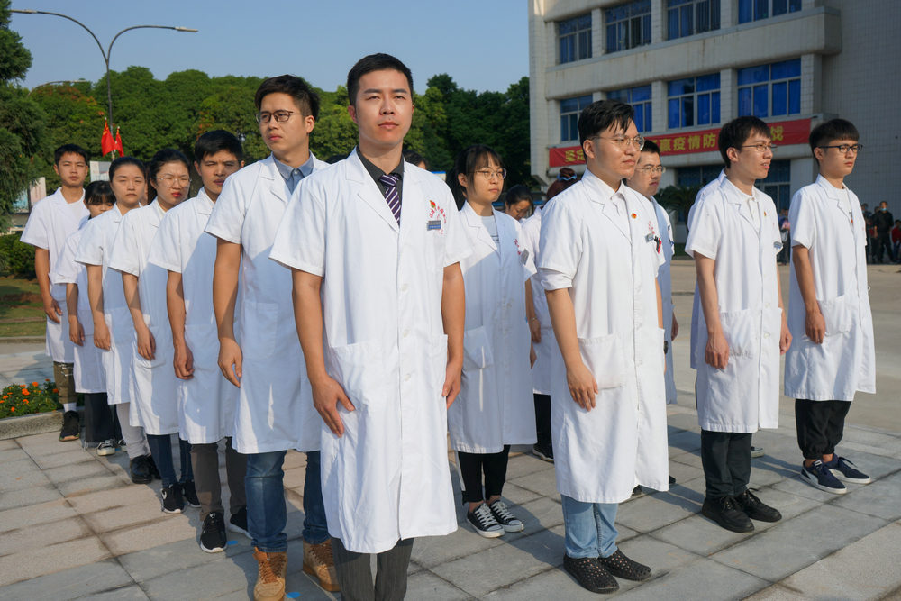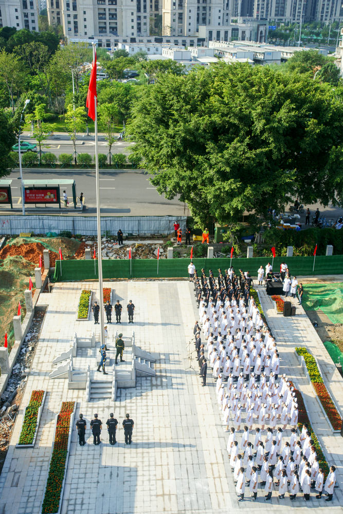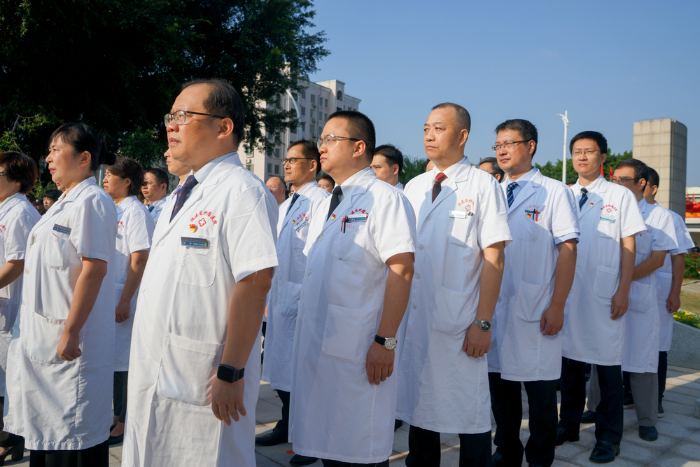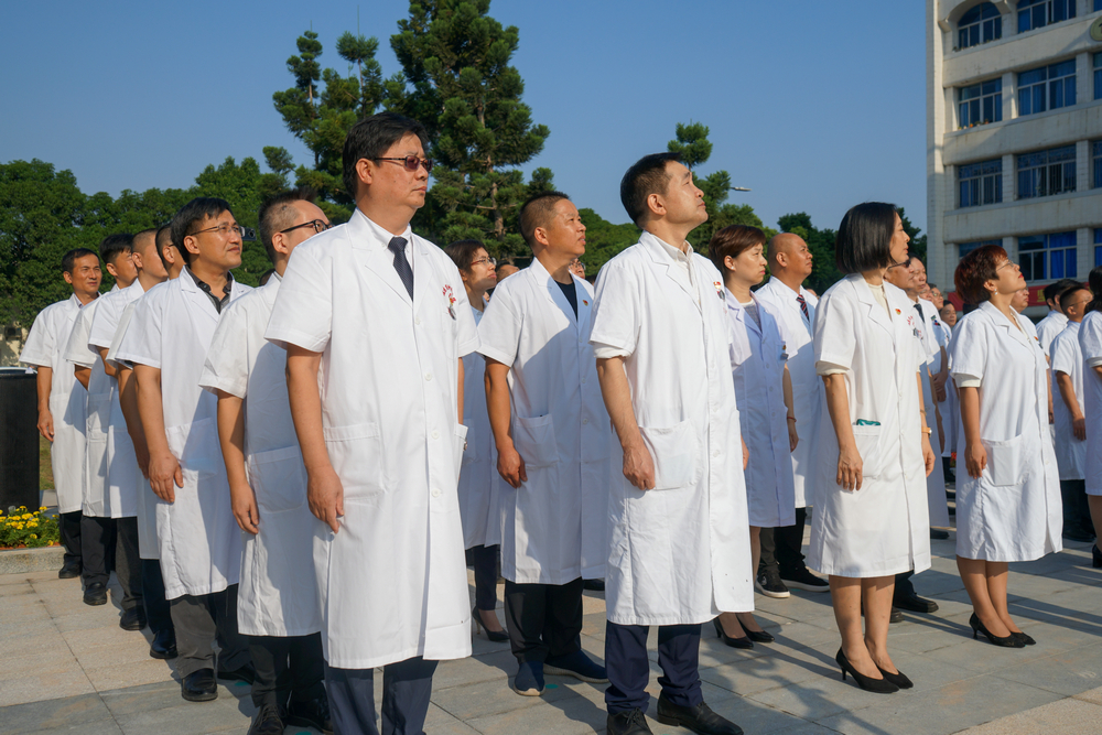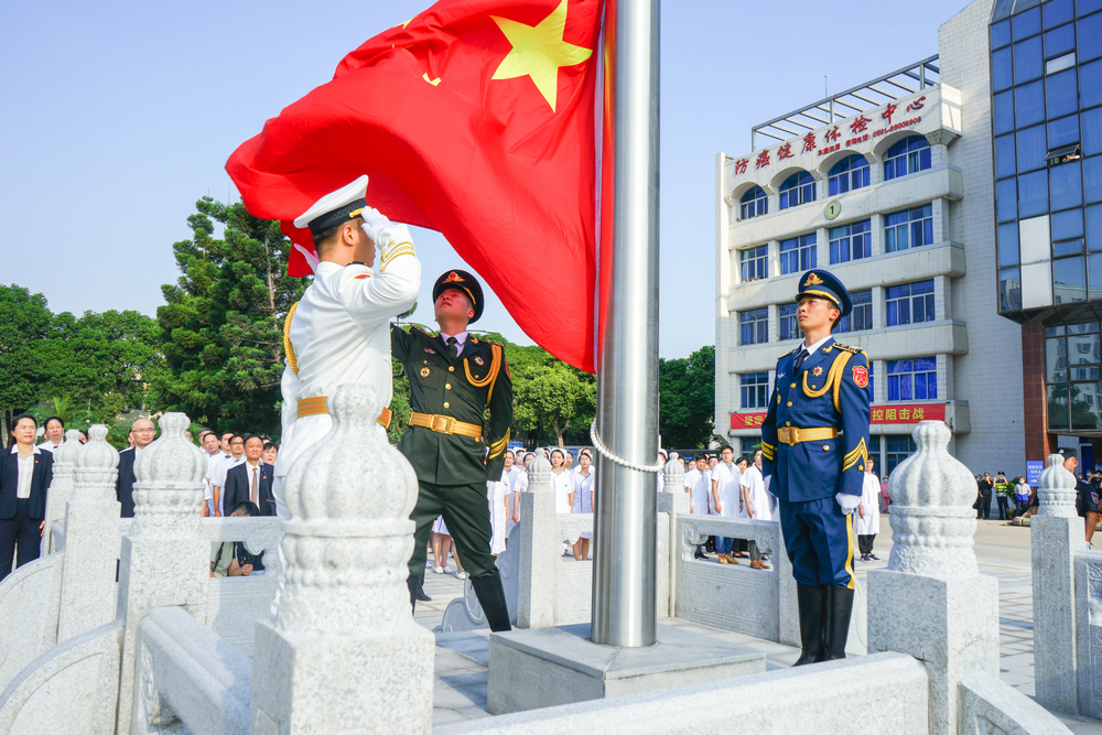 上午8时,升旗仪式正式开始。在铿锵有力、整齐划一的脚步声中,护旗队护卫着五星红旗走向升旗台。伴随着雄壮的国歌声,庄严的五星红旗冉冉升起。由院领导、医生、护士、职能科室、青年学生、安保队伍组成的6个方队近200人列队,庄严地向国旗行注目礼,齐声高唱中华人民共和国国歌,大家心潮澎湃,浓浓的爱国情怀激荡在每个人心中。