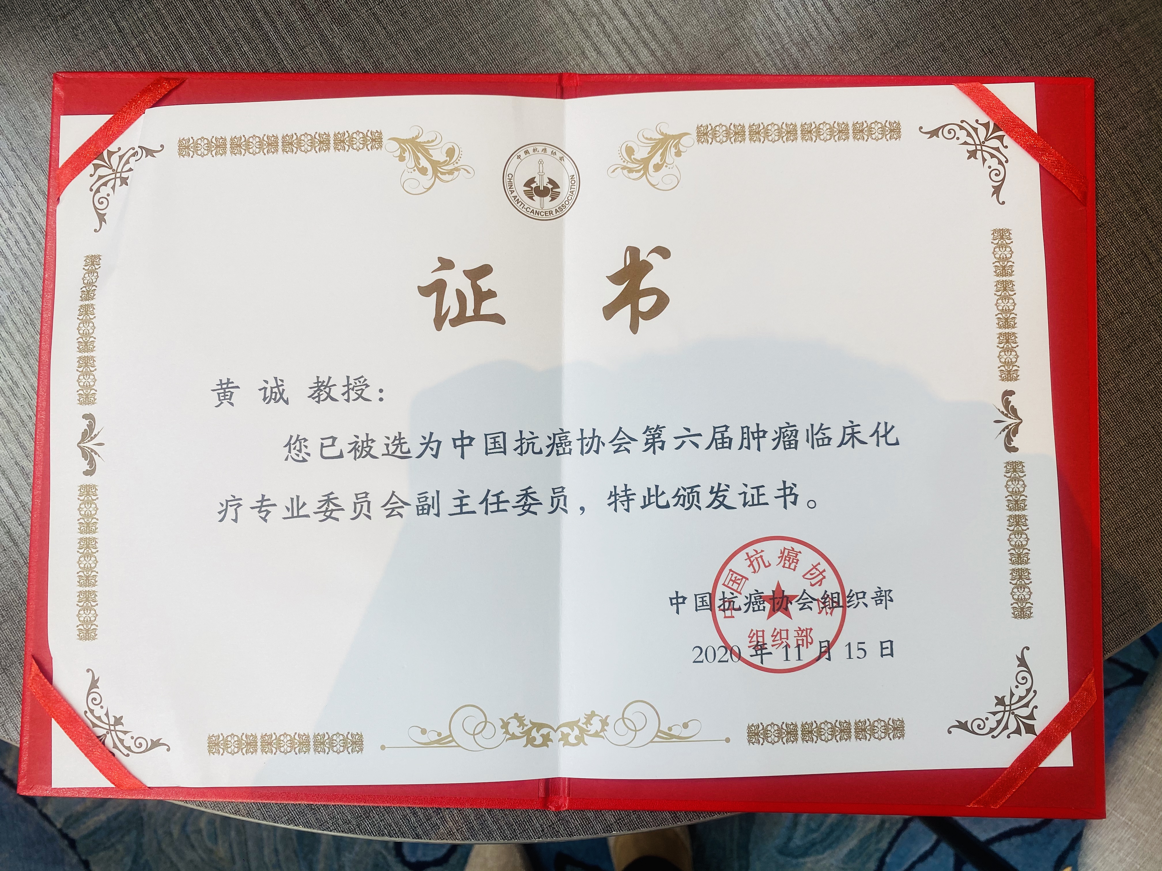2020年11月15日,中国抗癌协会肿瘤临床化疗专业委员会换届选举大会在2020中国肿瘤学大会(CCO)期间举行,经过选举产生中国抗癌协会肿瘤临床化疗专业委员会第六届委员会,共产生62名常委和199名委员。福建省肿瘤医院黄诚教授当选为副主任委员。