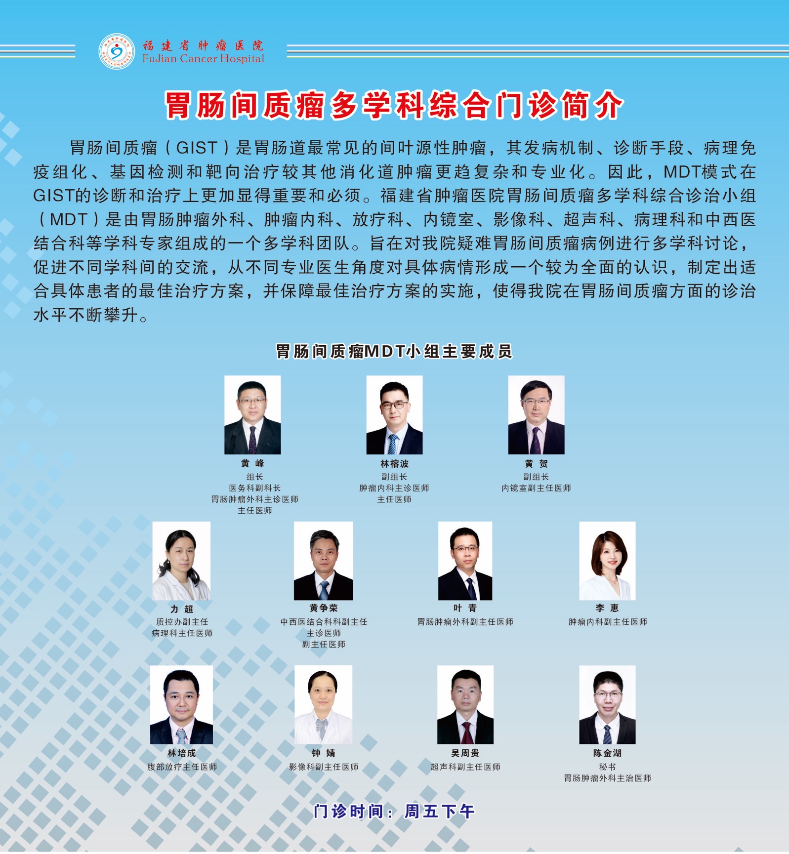 该门诊由胃肠外科黄峰主任医师牵头,依托我院胃肠间质瘤MDT团队,汇集了包括肿瘤外科、肿瘤内科、放疗科、中西医结合科、放诊科、超声科、核医学科、内镜中心、病理科等多个相关科室专家。结合疾病诊疗规范及学科的最新发展,通过多学科讨论的形式,综合评估患者病情,制定出科学合理、规范系统的诊疗决策,现场解答患者及家属的疑问。