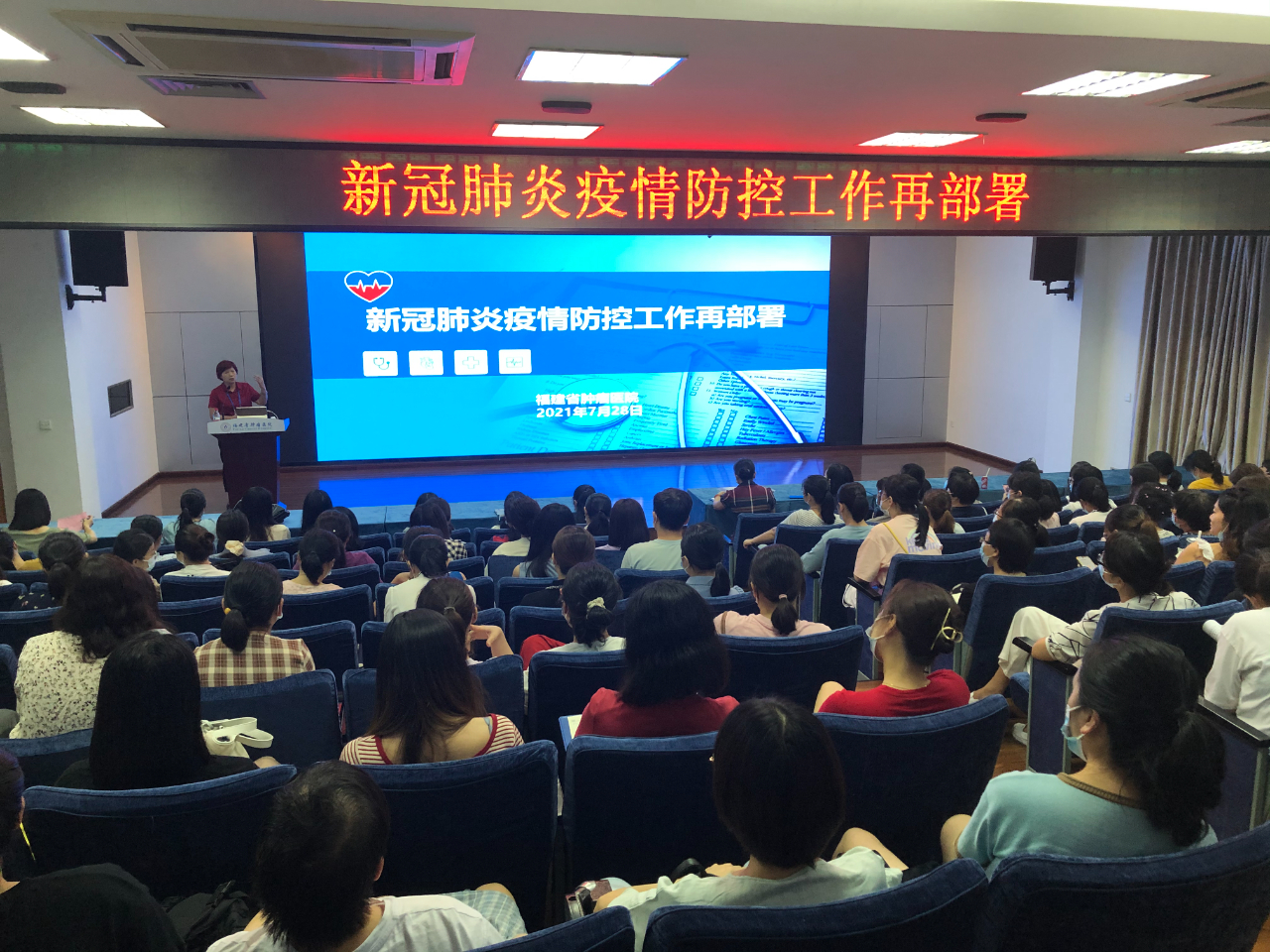 7月28日,国家卫健委召开新冠肺炎疫情防控工作再部署电视电话会议,我院副院长林伟、孙阳召集医务科、护理部等相关科室负责人参会。会后,护理部组织召开了 “新冠肺炎疫情防控工作再部署”会议,传达国家卫健委电视电话会议精神,落实关于“外防输入,内防反弹”决策部署。护理部骆惠玉主任、医务科王洋郁科长、各科室护士长及护理人员代表约160人参加。