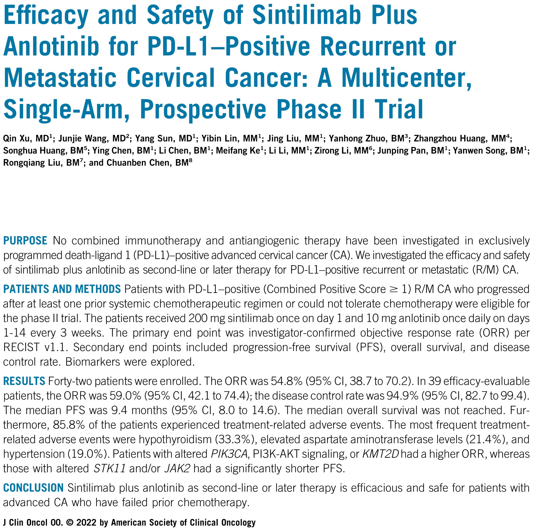 本项研究为PD-1抑制剂联合安罗替尼治疗晚期宫颈癌的多中心、随机、单臂II期临床研究,结果显示,入组宫颈癌患者中PD-1抑制剂联合安罗替尼展现出了持续性的获益,在意向治疗(ITT)人群中,客观缓解率(ORR)为54.8%;中位无进展生存期(PFS)为9.4个月,至研究结果发布中位总生存期(OS)尚未达到。在安全性上,联合用药≥3级不良事件的发生率只有20%。本研究提示免疫制剂联合抗血管靶向治疗能够提高复发或转移性PD-L1阳性宫颈癌患者的疗效,该研究进一步通过二次分析,也探讨了更精准挑选出联合治疗的获益人群。