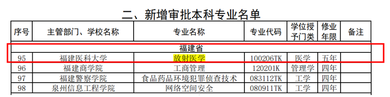 2月24日,教育部公布了2021年度普通高等学校本科专业备案和审批结果,福建医科大学“放射医学”专业获得教育部批准设立,自2022年起可招生。