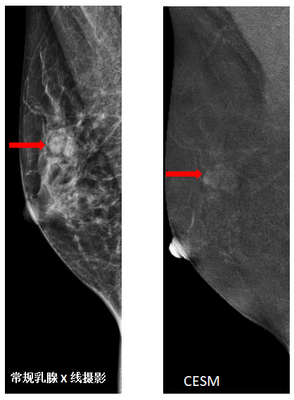 CESM(Contrast Enhancement Spectral Mammography)对比增强乳腺检查技术。其原理是利用碘造影剂,同时采集低能和高能数据并重建同一位置的两幅图像一套为(似传统MG)低能图像;另一套为能量减影图像:有效消除背景及腺体组织,仅保留碘剂代谢异常的乳腺病变。