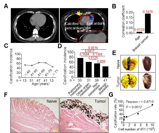 图1:乳腺癌患者和乳腺癌模型小鼠发生的心包钙化(图片源自PNAS)