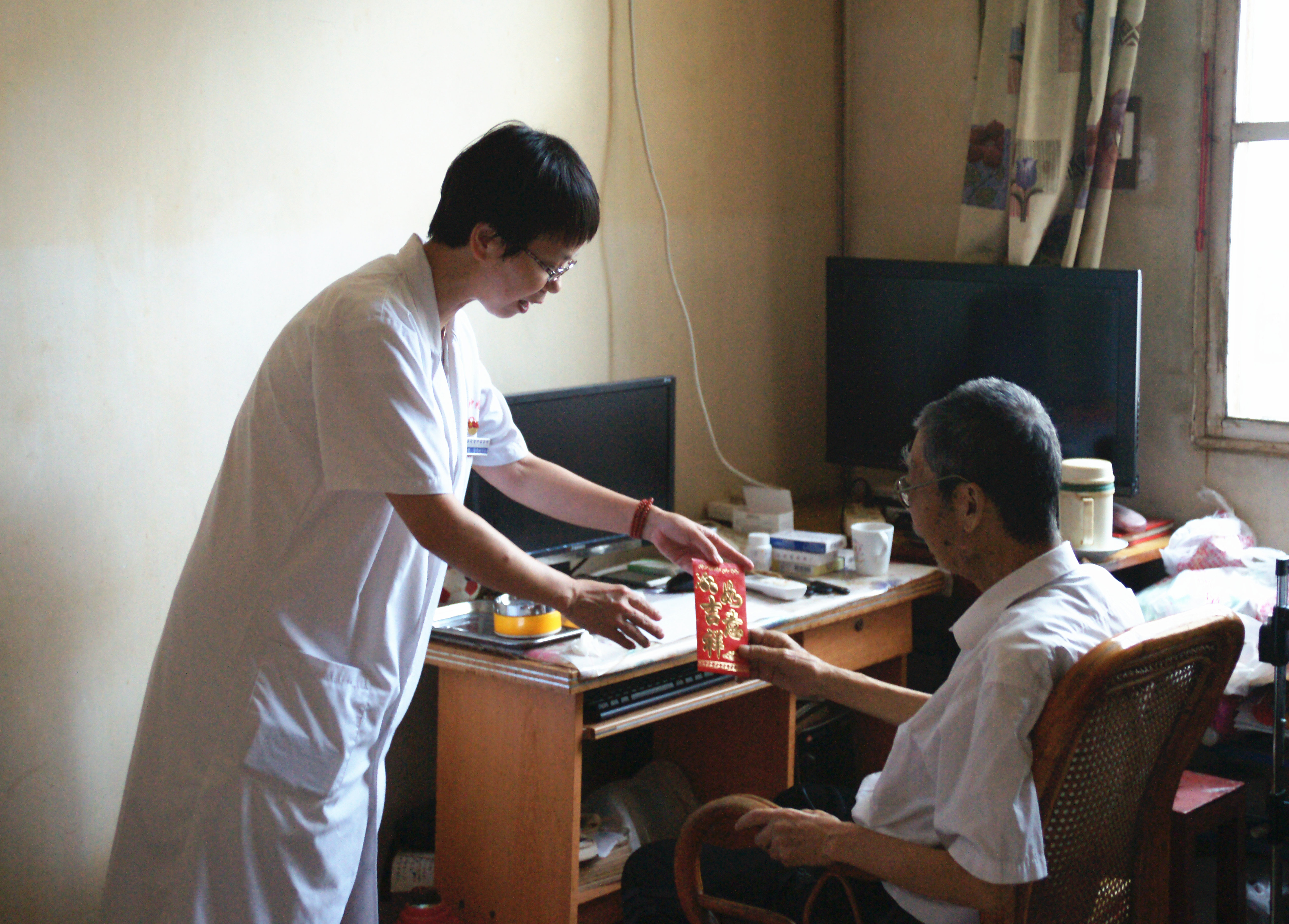 为庆祝建党95周年,弘扬党的光荣传统和优良作风,我院结合“两学一做”学习教育,开展走访慰问困难党员活动。7月6日上午,院党委副书记叶阿琴带领党办、工会有关人员,先到达困难党员刘后祥的家中,详细询问了他的病情以及生活状况,并送上党组织的关怀,鼓励他树立信心,战胜病魔。随后,一行人又到十七区慰问困难党员护士,鼓励她克服困难,乐观生活,祝愿她早日走出困境。
