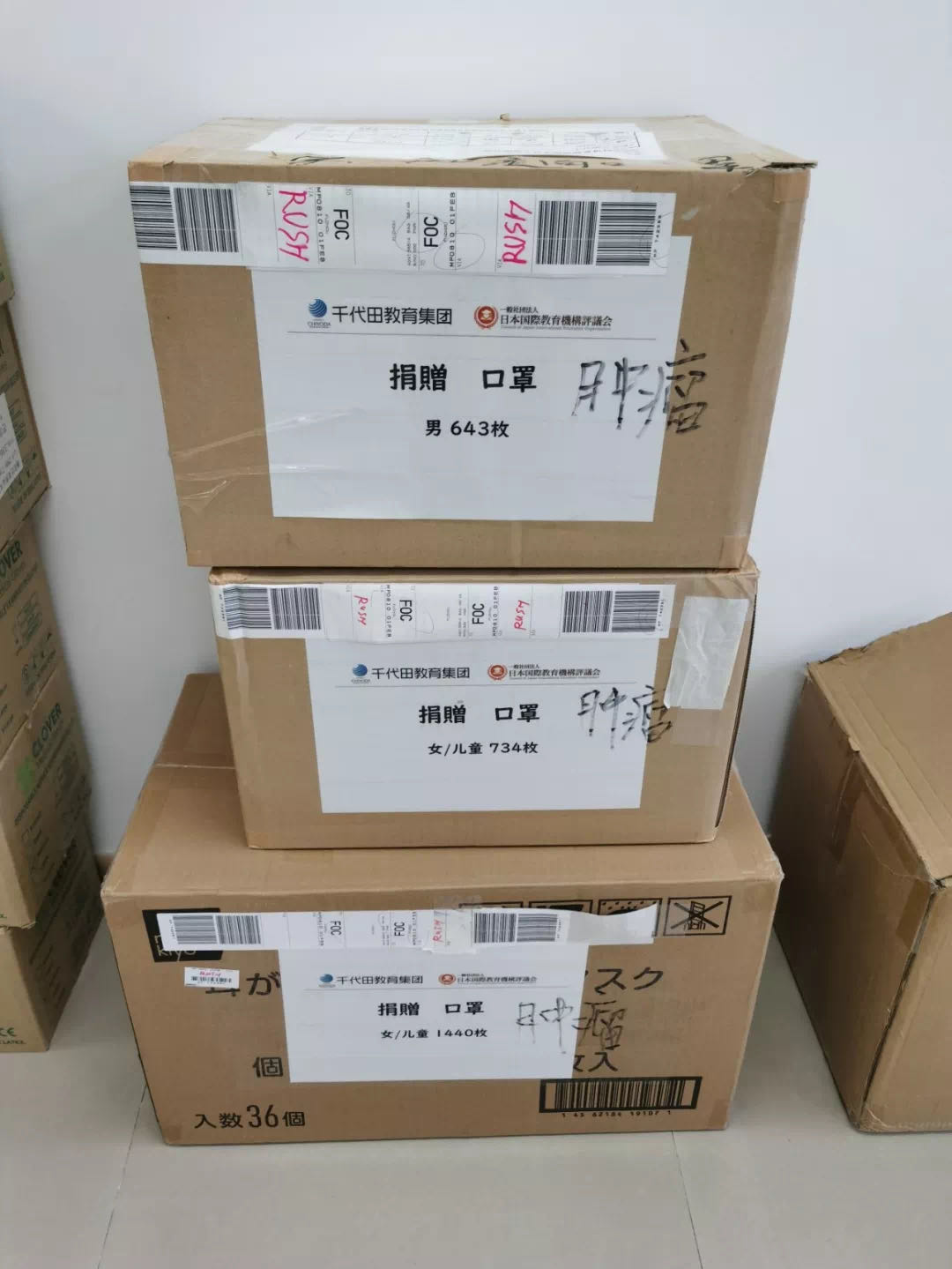 2月4日下午,由日本千代田教育集团定向捐赠我院用于一线医务人员疫情防控的3箱共2817枚口罩运至医院。该批爱心口罩由我院中医科陈云莺副主任医师联系海外亲属购买捐赠。