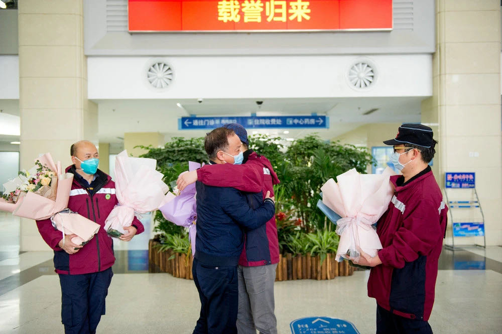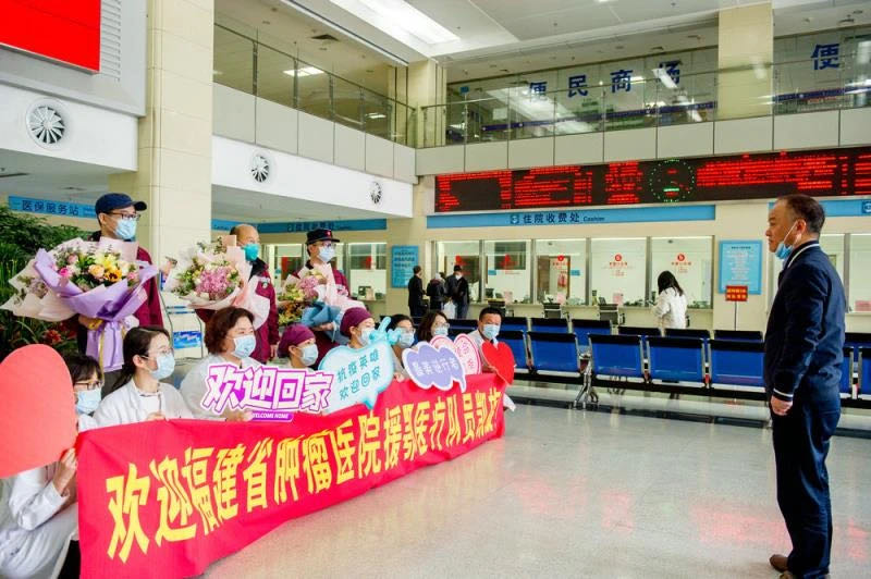 院领导林伟、蒋忠铭、余宏玉、孙阳及相关科室人员在医院外科楼一楼举行欢迎仪式,迎接三位英雄凯旋。欢迎仪式上,陈传本代表医院向他们在支援湖北抗击疫情一线期间的英勇行为和艰苦工作致以崇高敬意,向默默支持和辛苦付出的三位队员家属表示衷心的感谢,称赞他们不仅是全省卫生健康系统的荣耀,也是我们医院的骄傲,希望他们回家后好好休息,调整状态,把在前方的抗疫精神带回医院并传导给全院职工,为医院今后做好防疫工作和加强内涵建设更好地为患者服务形成正能量。