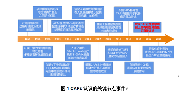 全面深入的认识CAFs经历了许多挫折,以往认为CAFs主要能促进肿瘤的生长、侵袭转移以及血管生成,但现在已经发现CAFs的功能比较复杂,在肿瘤发生发展过程中具有两面性的作用,下面这个图总结了CAFs主要的认识历程中重要的节点事件。